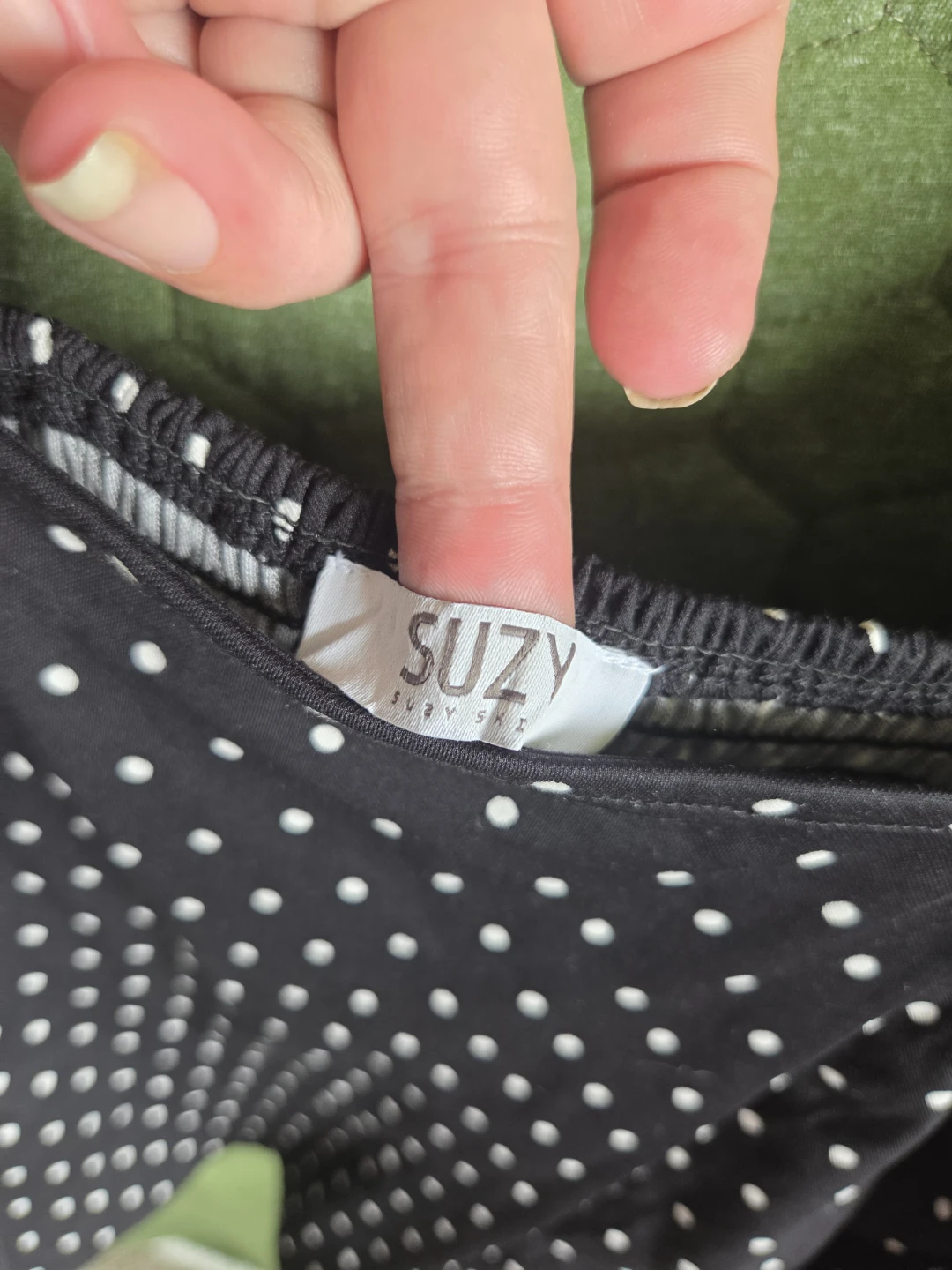 This Suzy Woman top features a black and white polka dot pattern. It has a square neckline and puff sleeves with elastic cuffs. The smocked front adds a nice touch of detail.