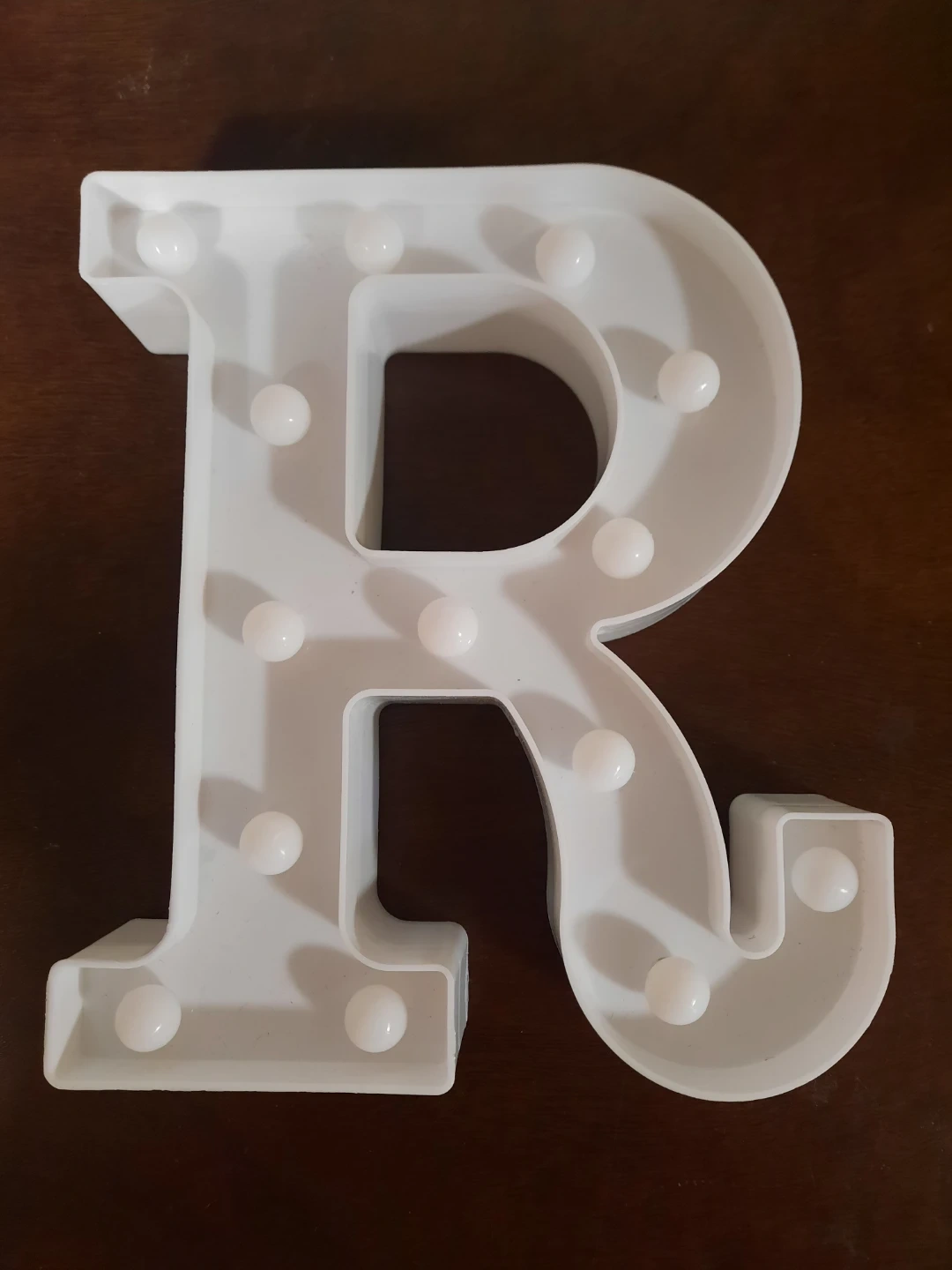 This is a white marquee letter R light. It's made of plastic and has small LED bulbs. This light would be nice for a party or as a decoration. 9 inches. Needs batteries, it works