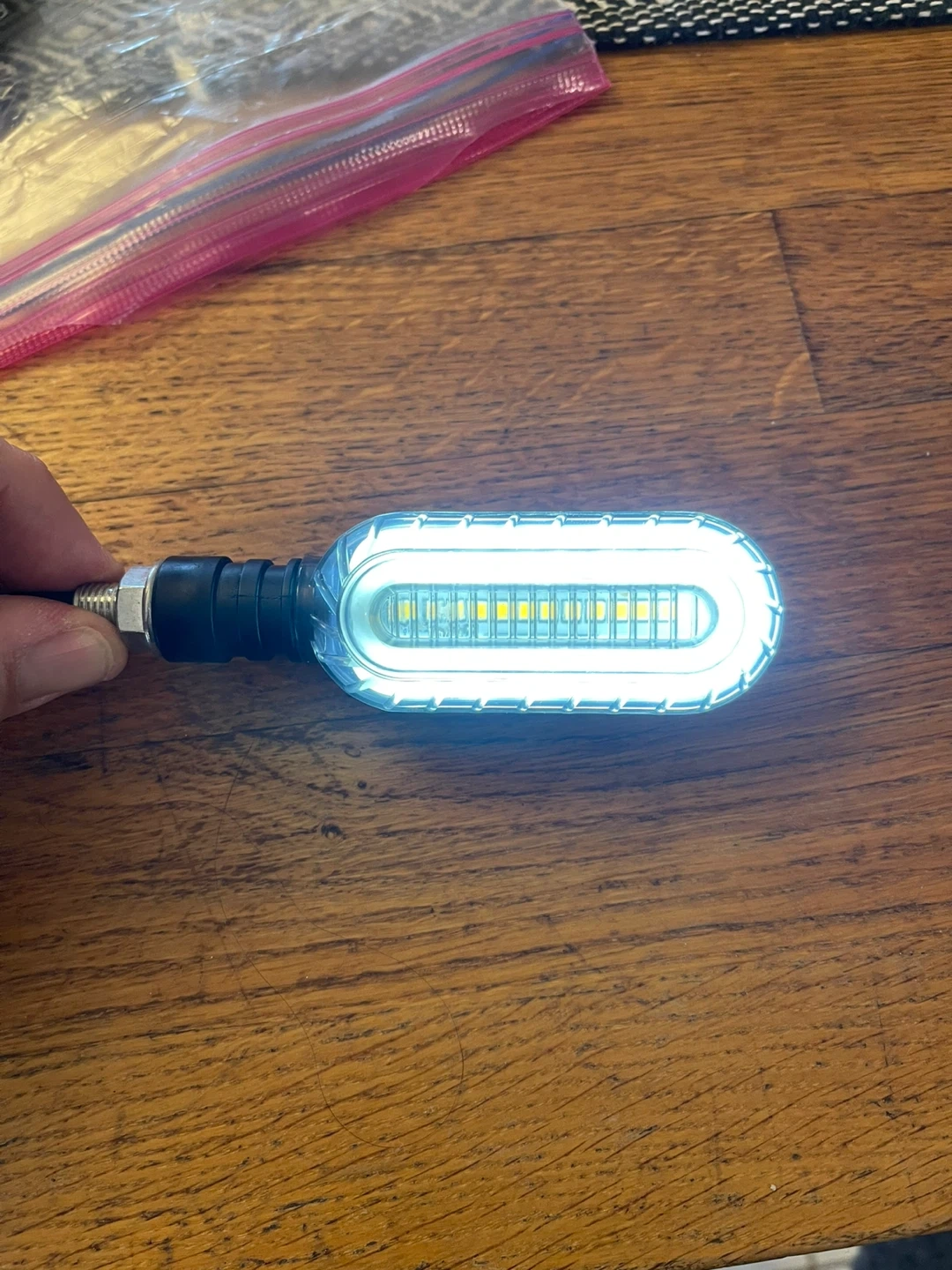 Set of 4 motorcycle LED lights, with 2 red and 2 white units. These lights feature sequential flowing indicators and can function as DRL or brake lights. They're designed with a clear lens and amber, red, or white illumination. Great for enhancing motorcycle visibility and style!