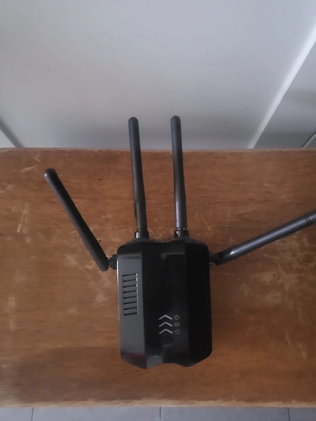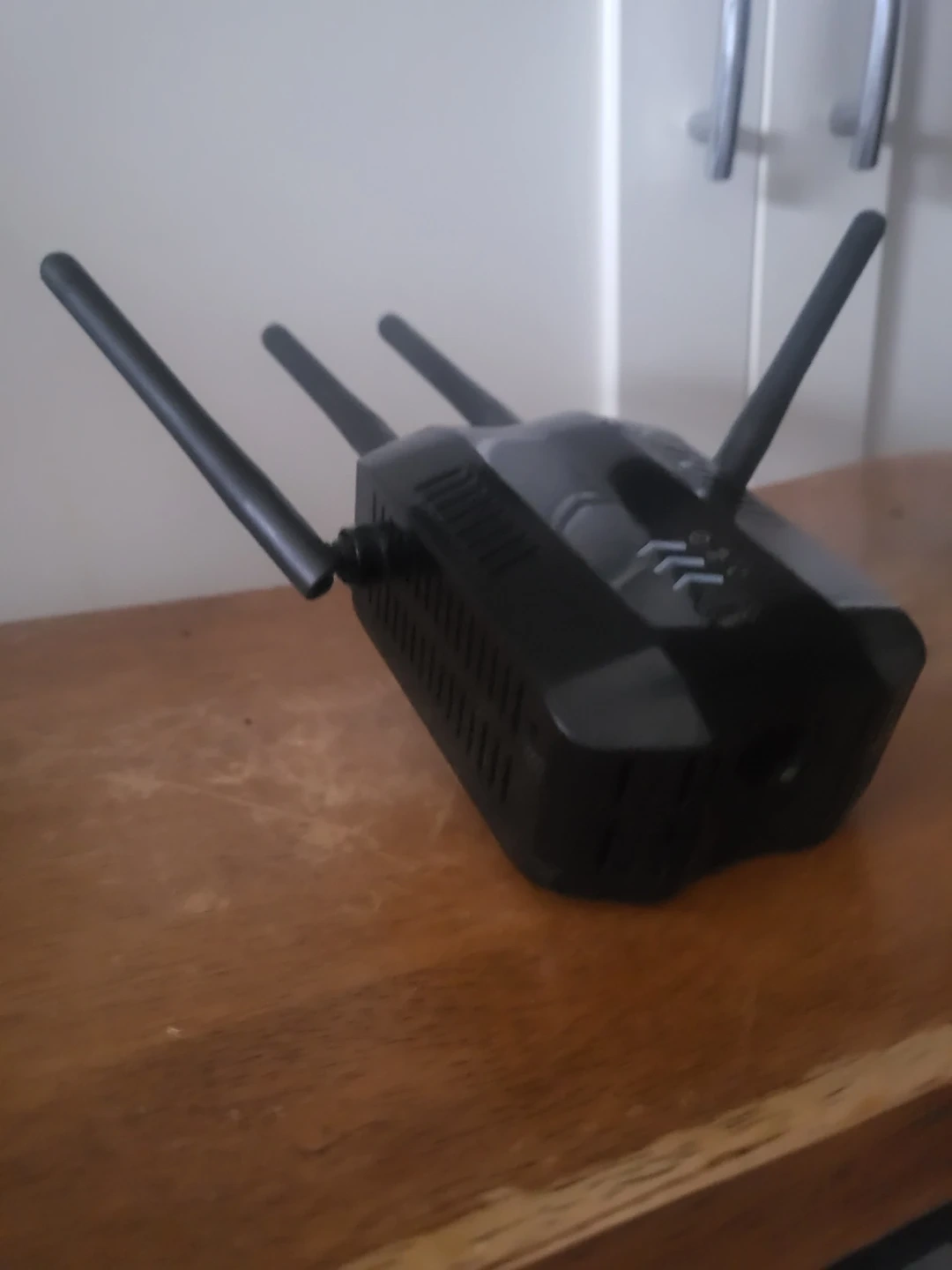 This is a black Wi-Fi extender. It has multiple adjustable antennas for better signal reach. It's a simple device to boost your home network.