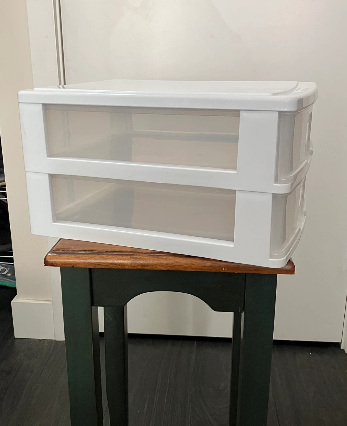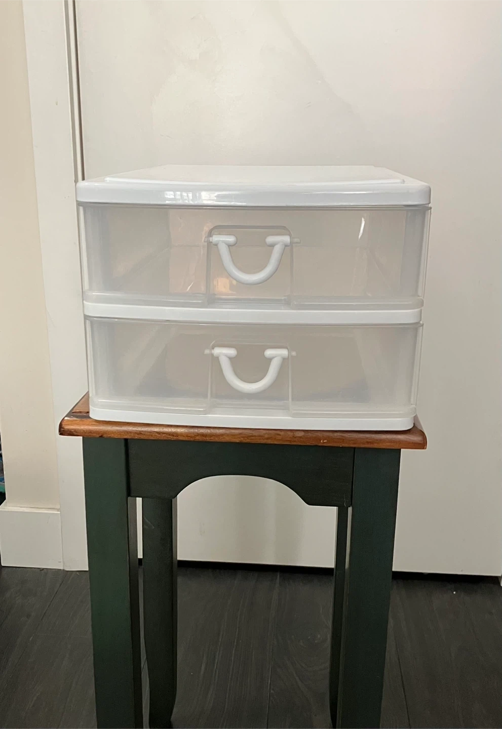 Gracious Living two-drawer storage unit. Plastic construction. White frame with clear drawers. It's great for organizing small items.