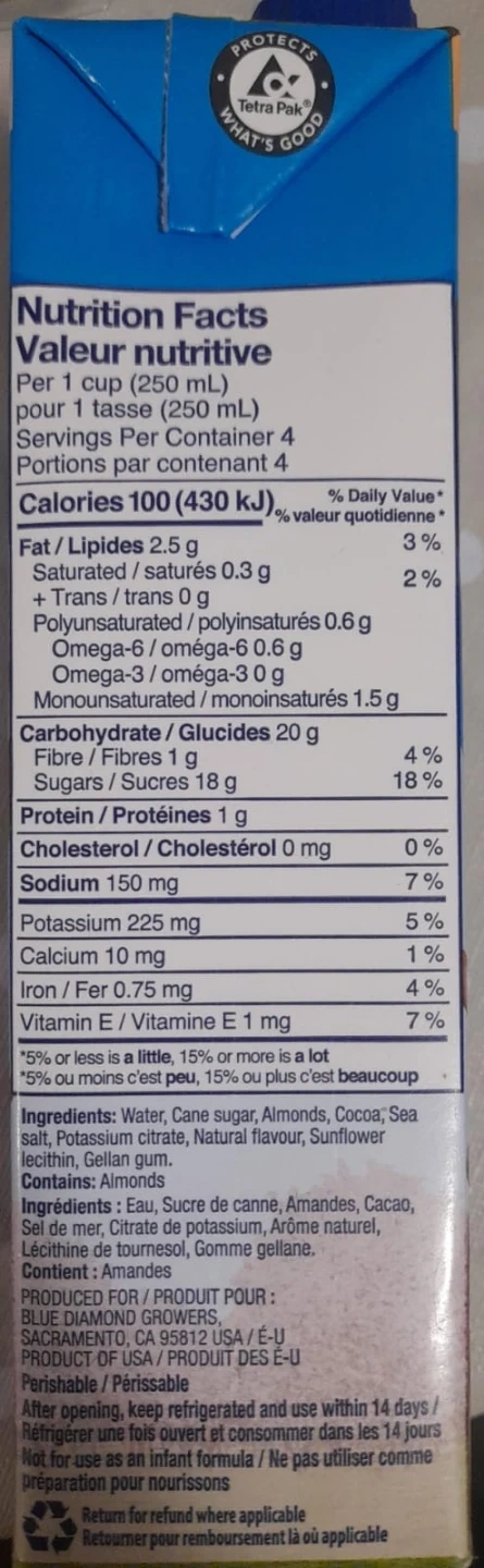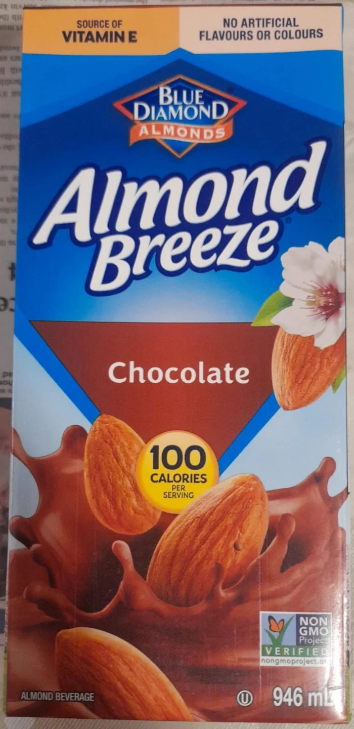 Chocolate almond beverage made with Blue Diamond almonds. It's gluten-free, dairy-free, and lactose-free. Contains 100 calories per serving.
