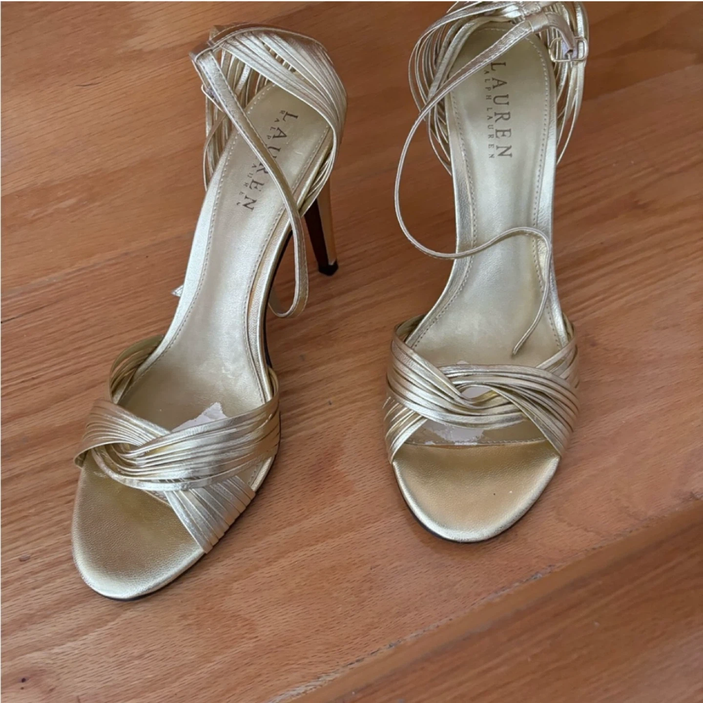 Selling a pair of Ralph Lauren heels in a beautiful gold colour. They are size 7.5M. The upper material is leather.These heels are perfect for a night out or a special occasion!