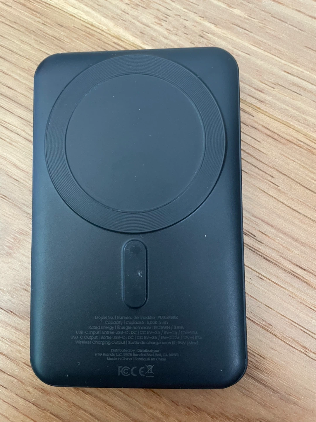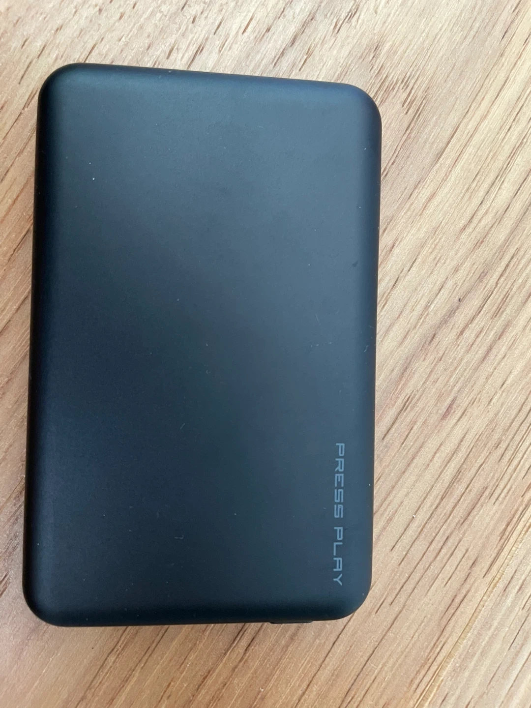This is a black Press Play MagSafe compatible power bank with a 5000mAh capacity. It supports USB-C input and output, as well as wireless charging up to 10W. It's great for keeping your phone charged on the go!