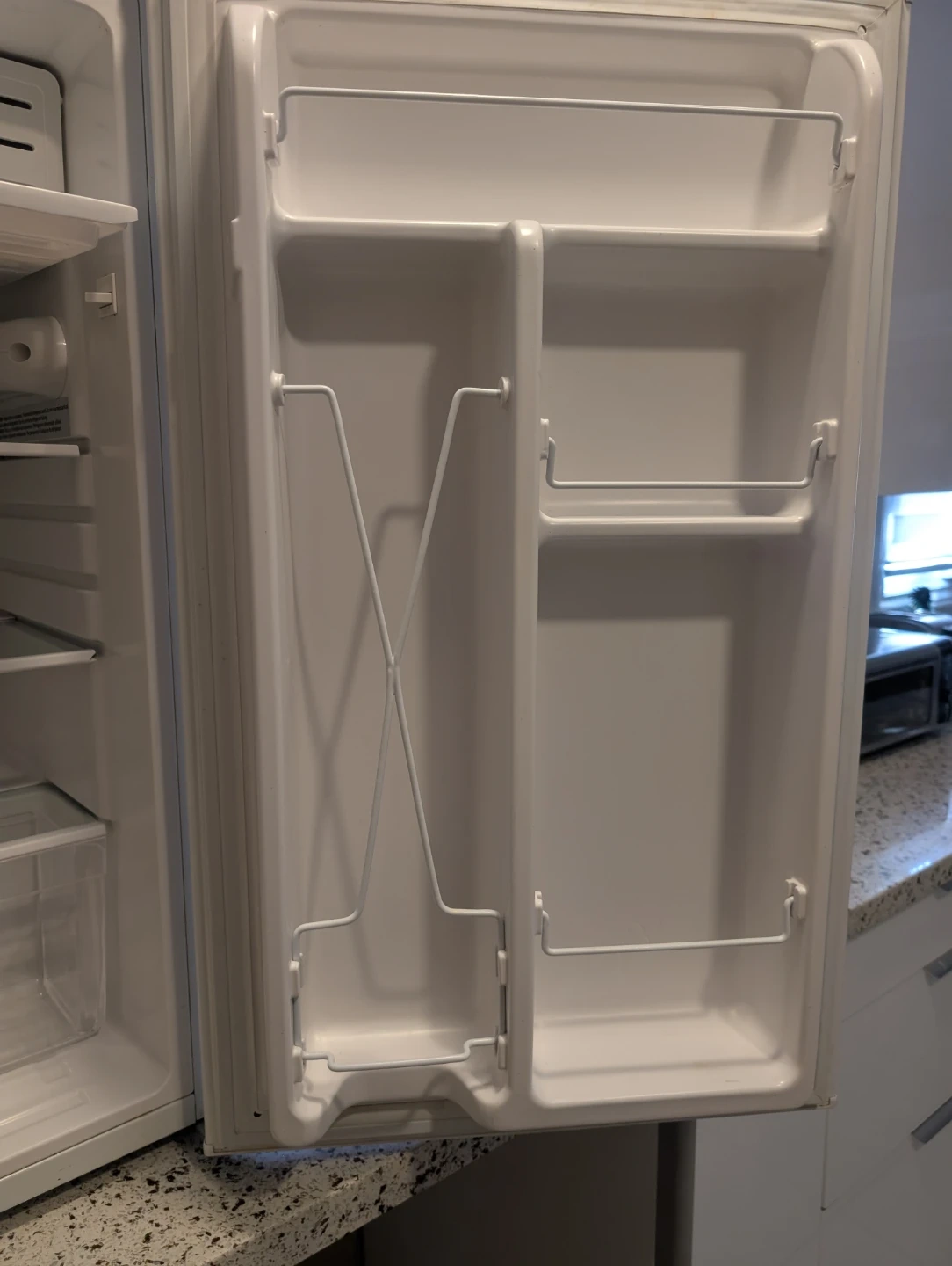 White RCA mini fridge with adjustable shelves and a door rack. It's compact and perfect for a dorm room or small space! The interior features a crisper drawer. Excellent condition, barely used, perfectly clean. 80x48x44 cm