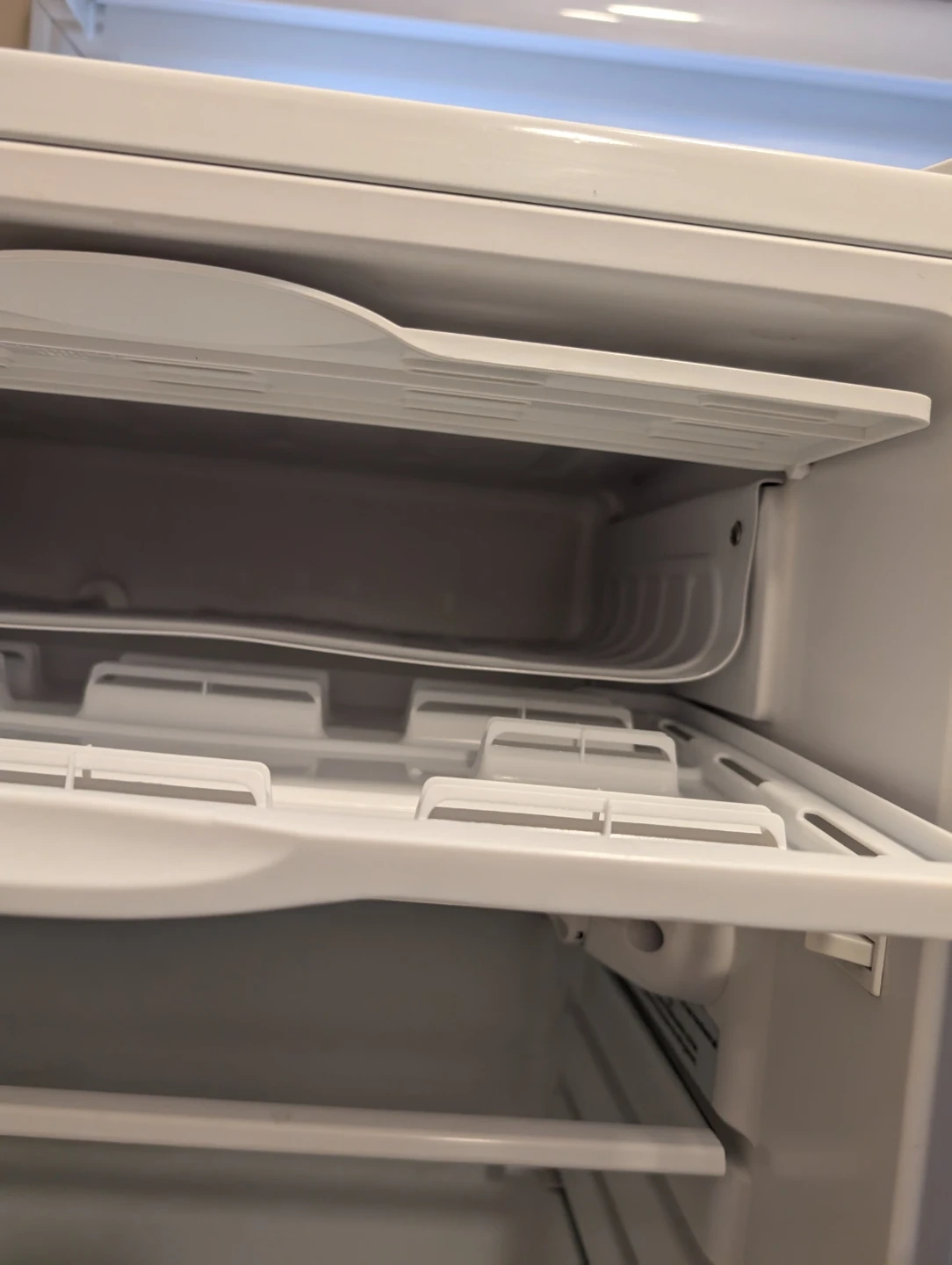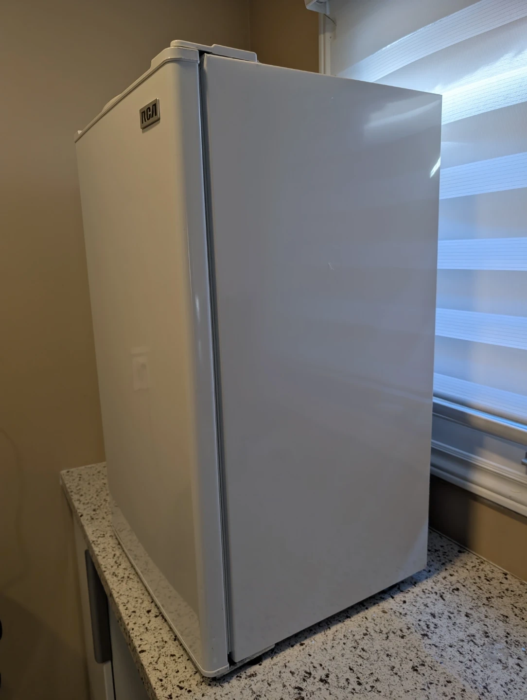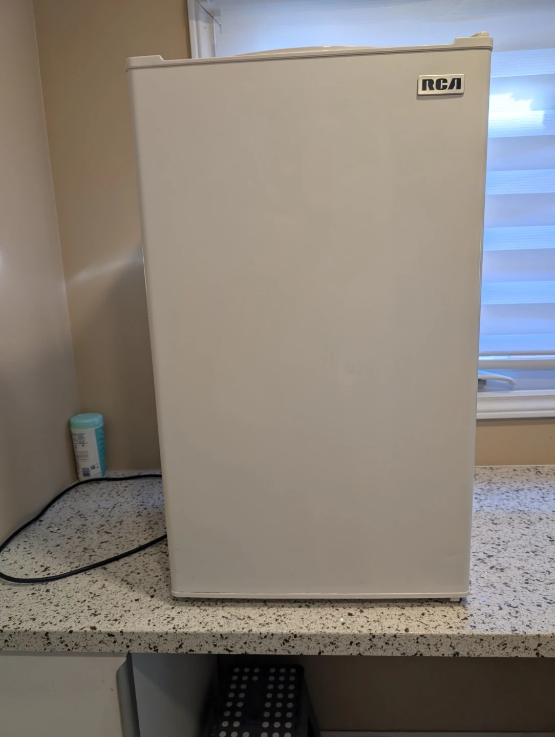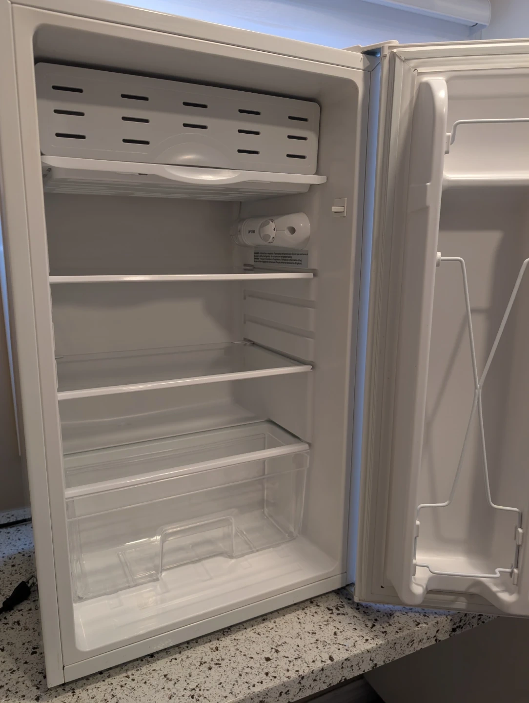 White RCA mini fridge with adjustable shelves and a door rack. It's compact and perfect for a dorm room or small space! The interior features a crisper drawer. Excellent condition, barely used, perfectly clean. 80x48x44 cm