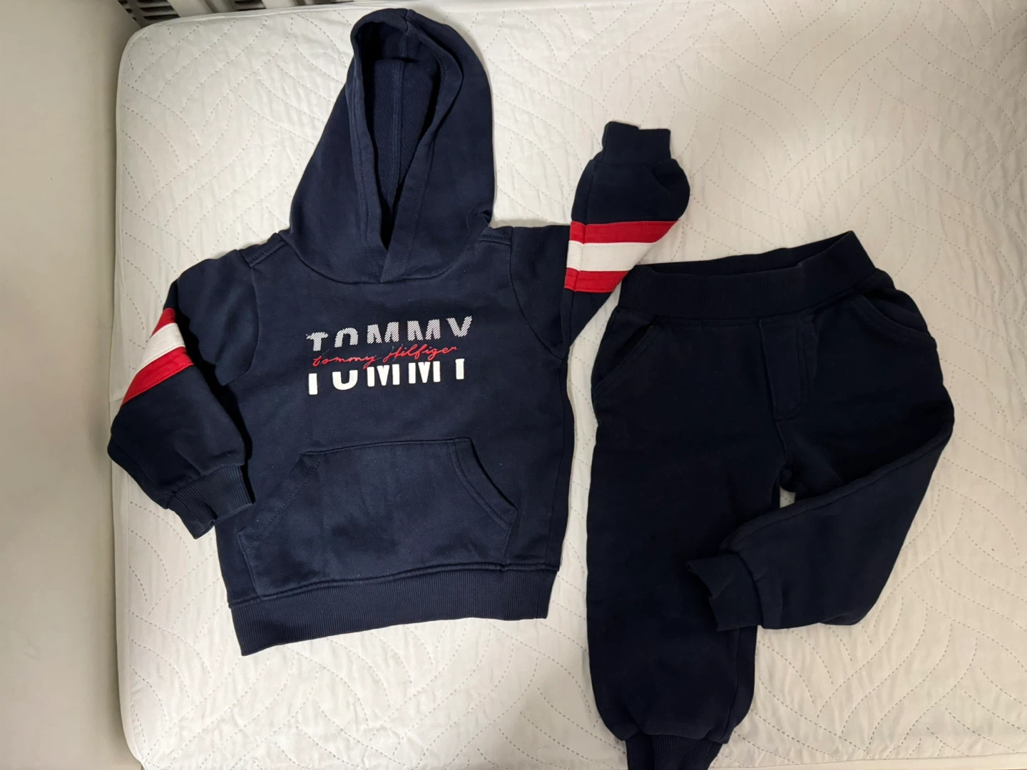 Tommy Hilfiger kids' matching set, perfect for your little one! The set includes a navy blue hoodie with the Tommy Hilfiger logo and matching pants. Great for everyday wear!