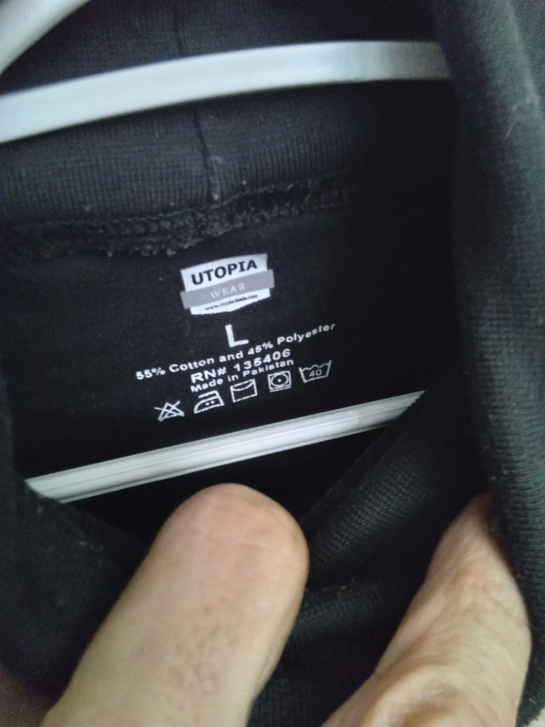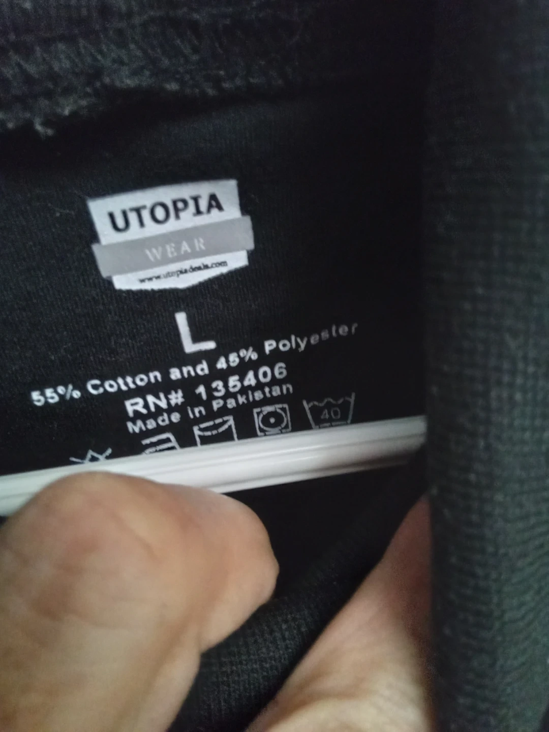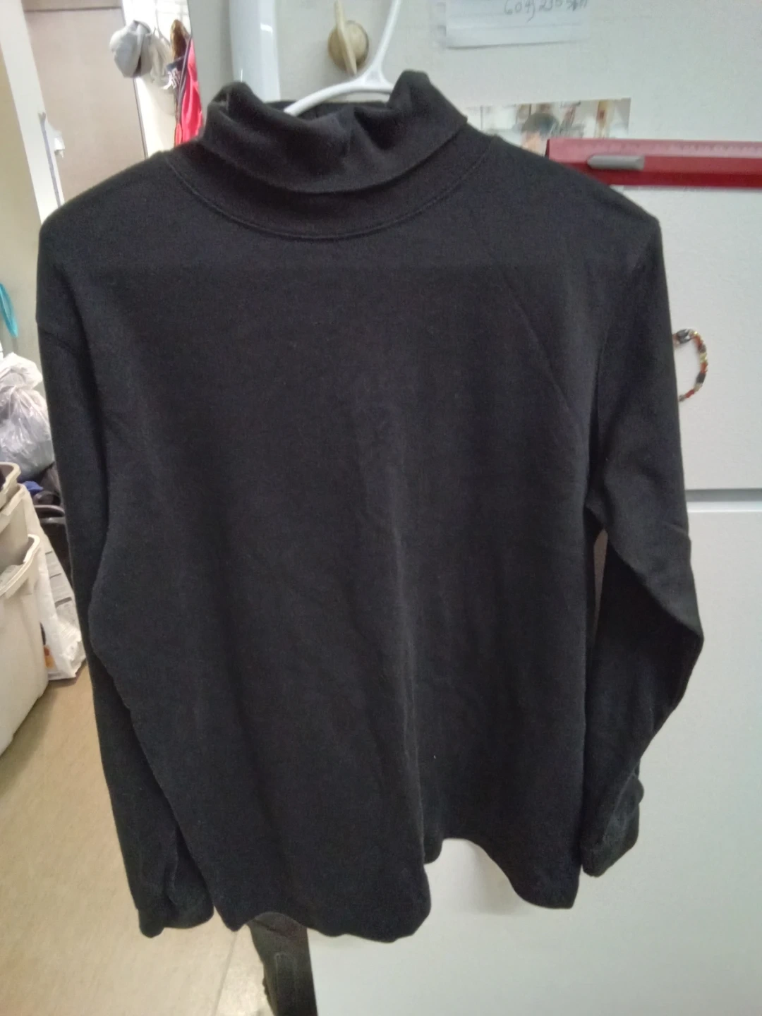 Selling a gently used black turtleneck from Utopia Wear in size L. The material is 55% cotton and 45% polyester. It's in great condition and ready for a new owner!