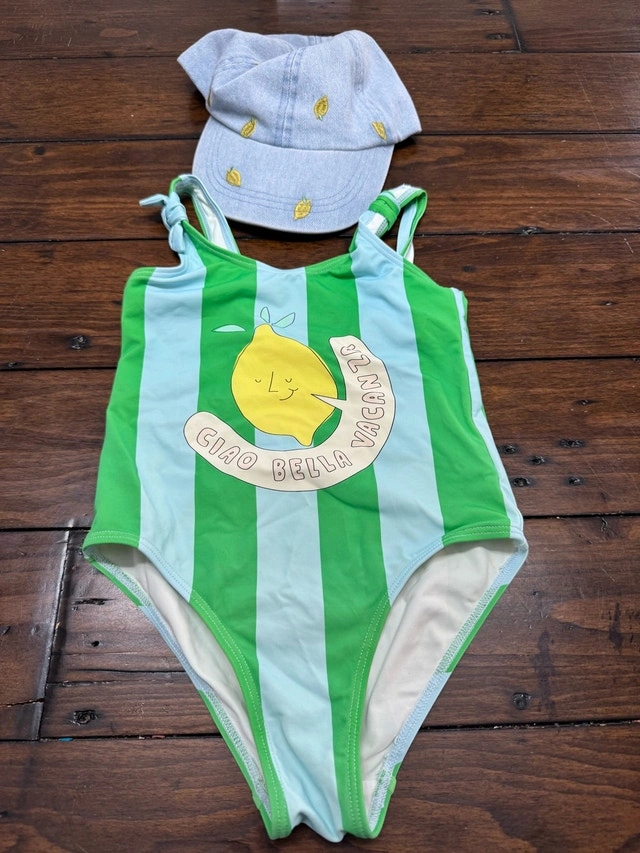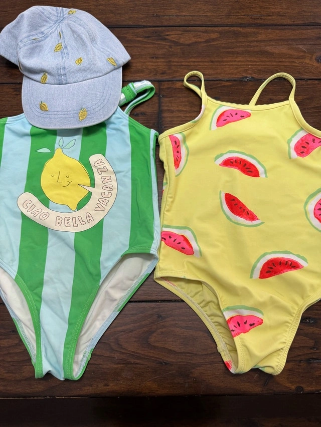 This ZARA swimsuit set, size 4/5T, includes a playful lemon-themed swimsuit with a matching hat and a watermelon-themed swimsuit. Both swimsuits are in used-good condition and ready for some fun in the sun! Cash accepted.