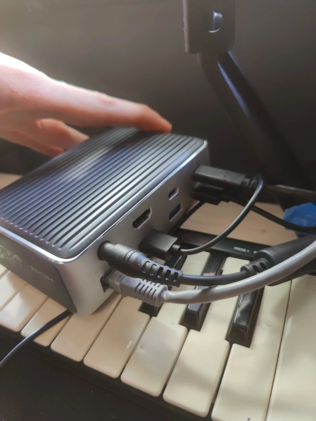 A compact docking station for your PC. It has multiple USB-C and USB-A ports, HDMI, and an SD card reader. This device offers expanded connectivity for your computer!
