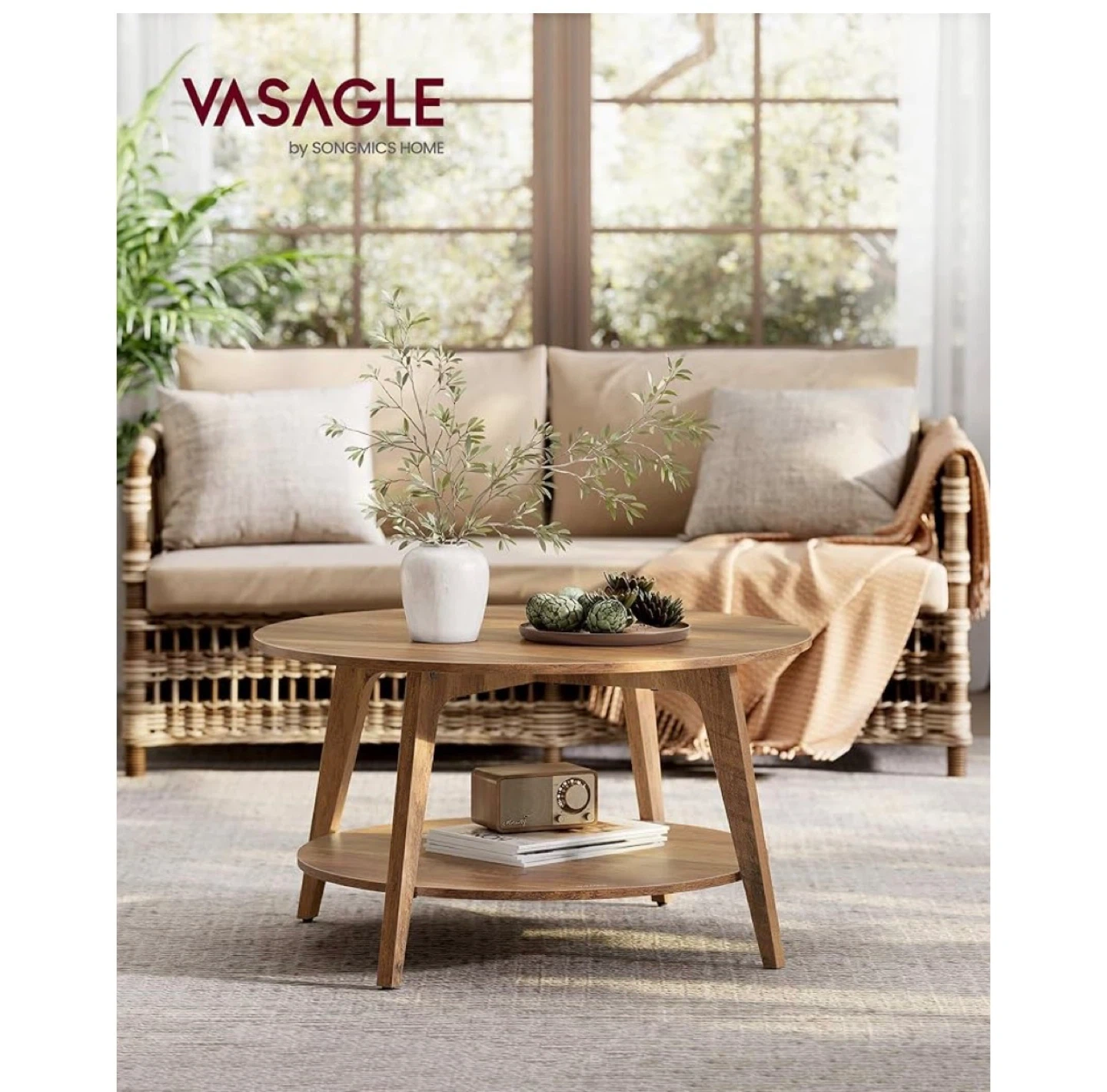 This VASAGLE coffee table features a durable wooden construction with a natural finish. It has a round tabletop and a lower shelf for extra storage space. The dimensions are 31.5" (80 cm) in diameter and 17.7" (45 cm) in height.