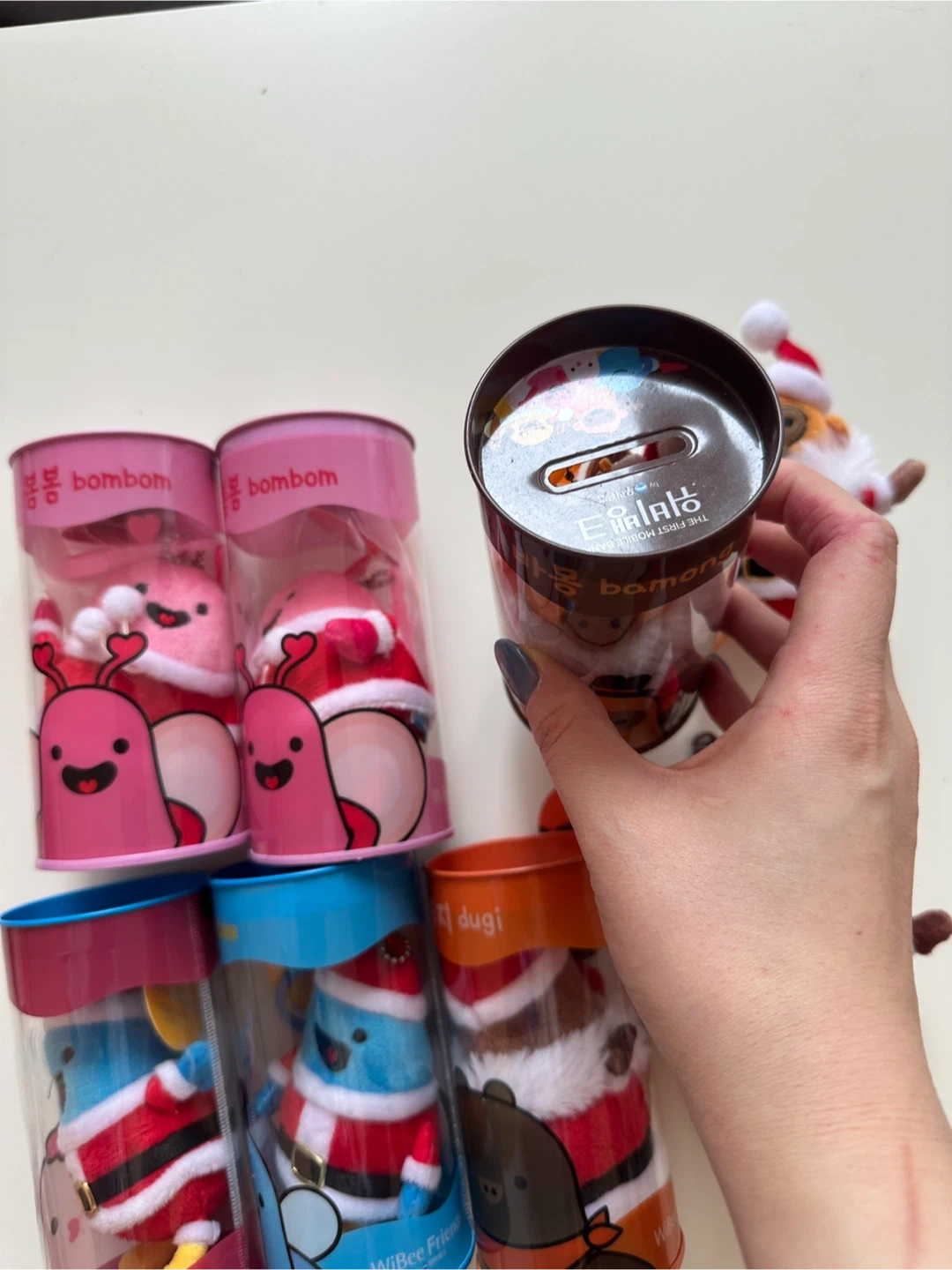 Set of WiBee Friends and Bomong plush toys dressed in festive Christmas outfits. These cute collectible characters come in individual cylindrical packaging. Perfect for adding some holiday cheer to your desk or bag!