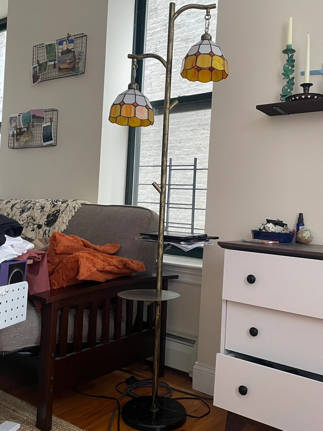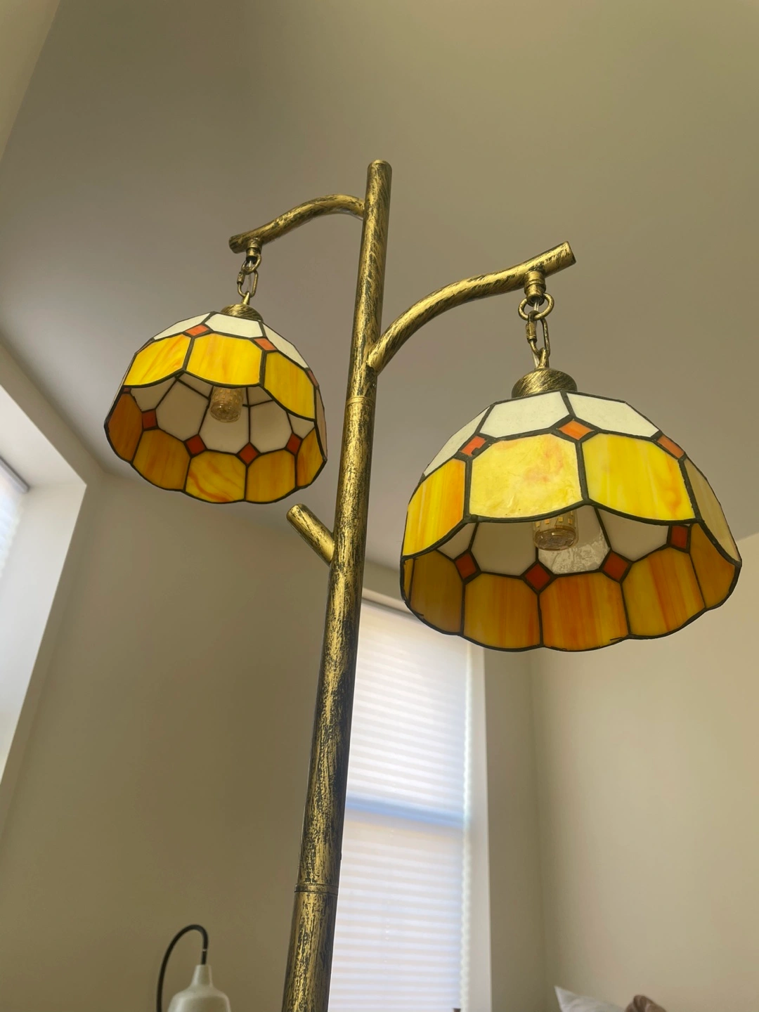 Tiffany style floor lamp, two stained glass shades. Features two small shelves. Gold metal frame. Comes with remote for dimmable lights.