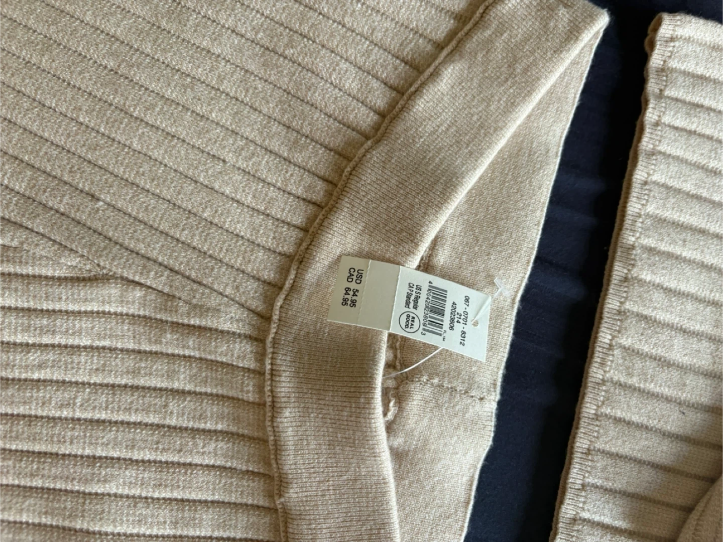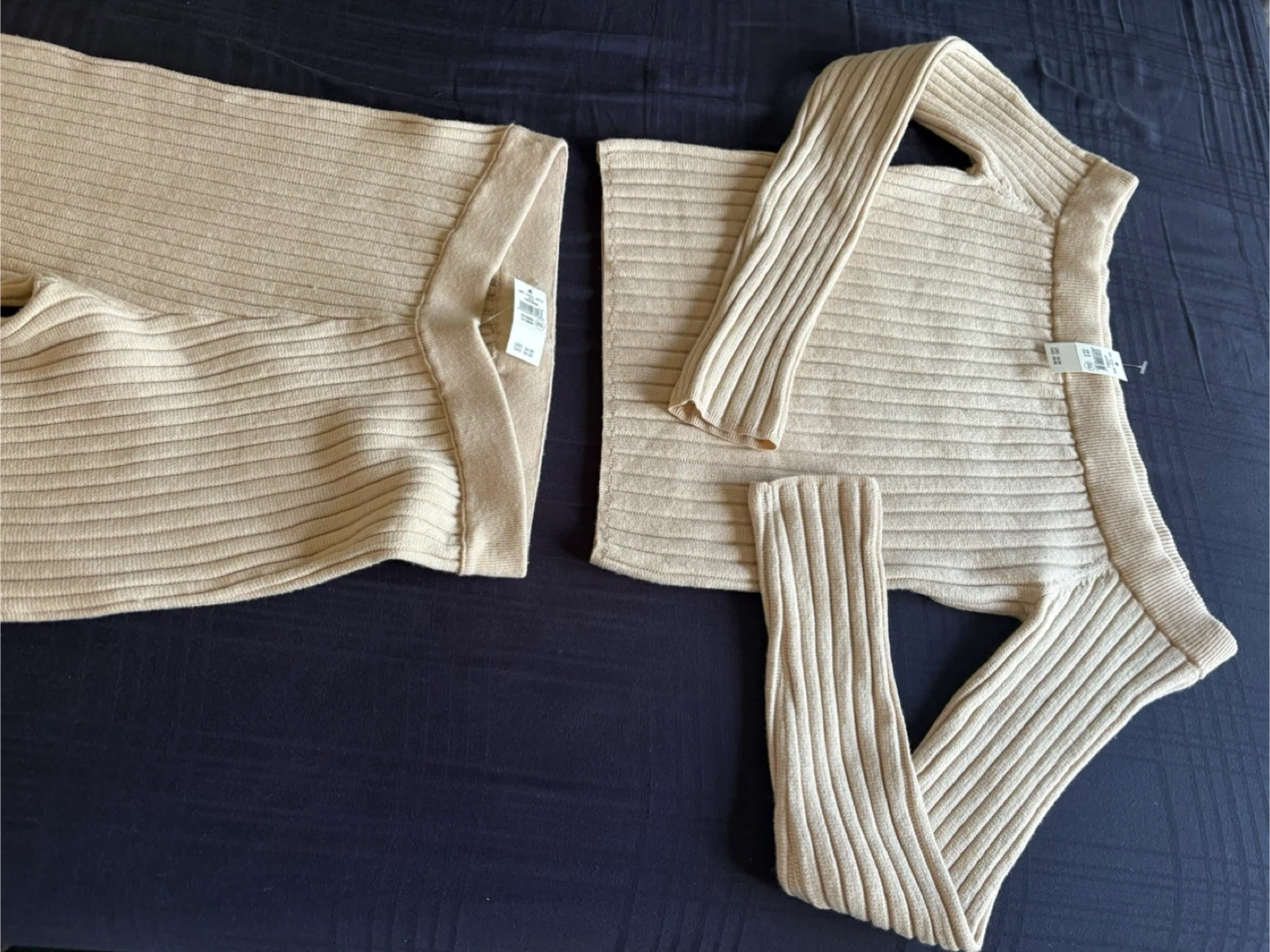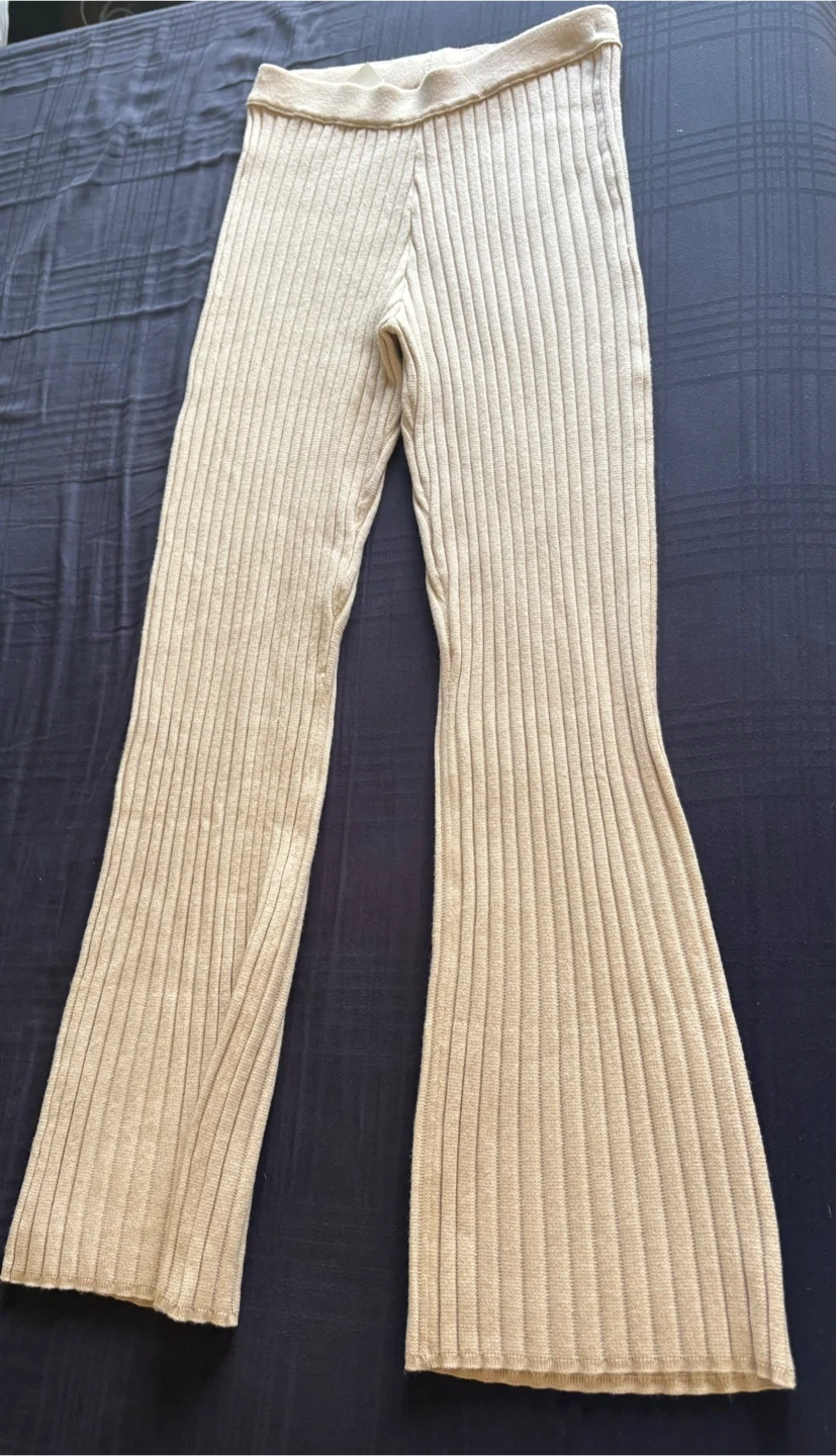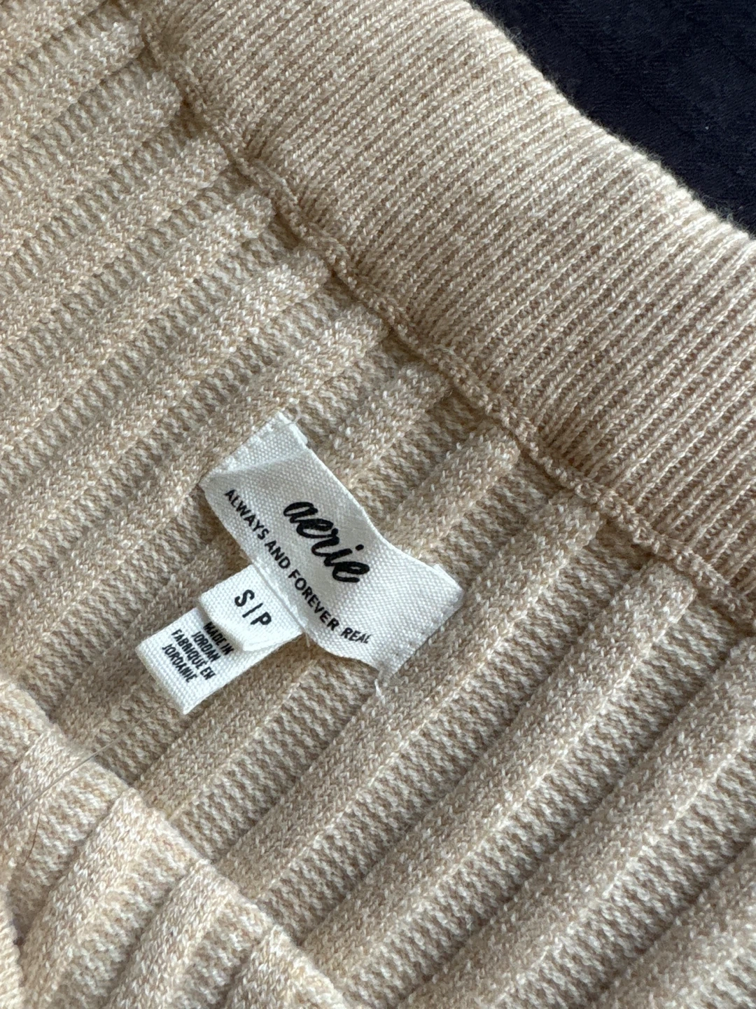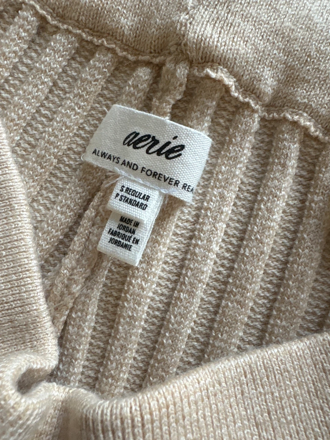 This is a beige off she shoulder ribbed knit sweater pant set from Aerie. Both are a size S/P and made in Jordan. Never worn. Selling one in black as well if interested.