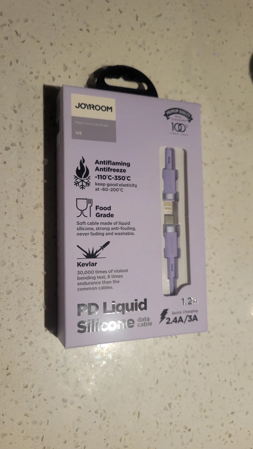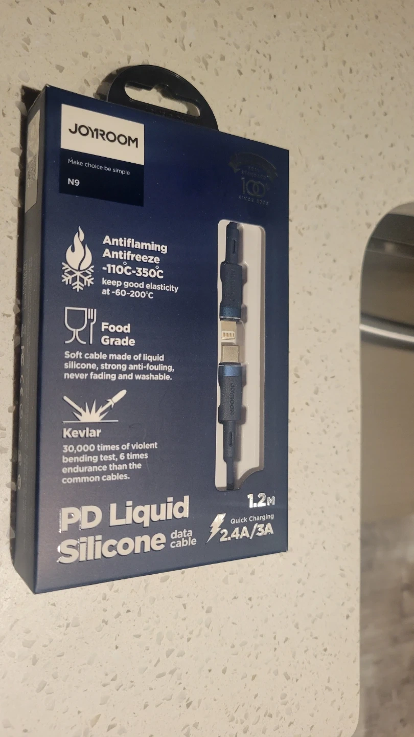 This Joyroom data cable (type c to lightning) is made with PD liquid silicone and features antiflaming and antifreeze properties. It's food-grade and built with Kevlar for durability, capable of 35,000 violent bending tests. Supports 2.4A/3A quick charging. Choose your color between white, black, purple, mint, red and blue. Good as an extra cable for charging Airpods or iPhone at home, in the office or in the car.