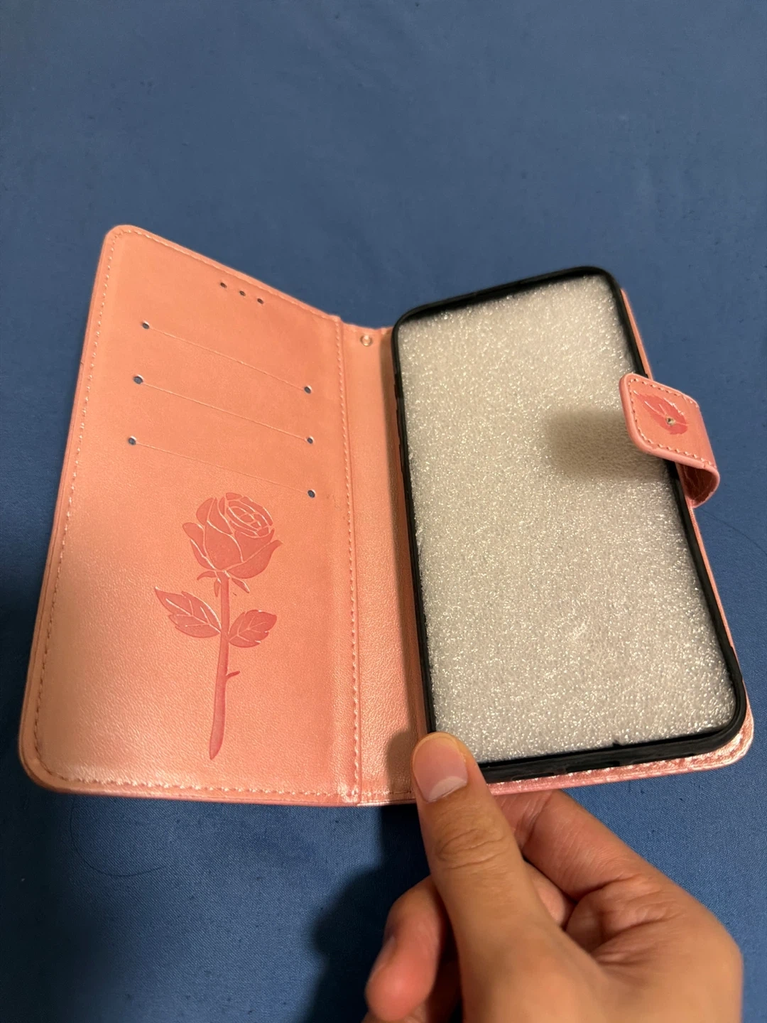 Two stylish wallet cases for phones. One is a rust-coloured faux leather with a zippered coin pouch and wrist strap. The other is a pink case with a floral design and butterfly embellishment. Both cases feature card slots and a secure closure. Keep your essentials organized and your phone protected! $15 each case or both of them for $25