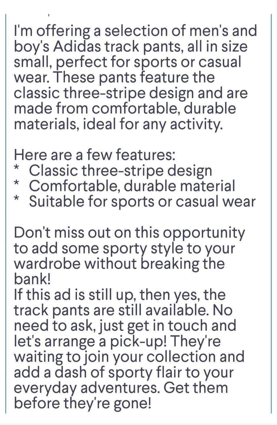 I have more Track Pants and Size M /L/ XL / XXL/ 2XL AND 3XL for Men's and Boys for sale different prices different colors and different Brands if you want you can come to see all Track Pants only cash price firm.