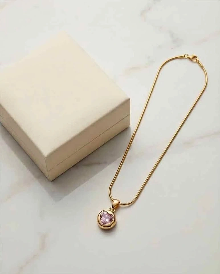 Elegant 18K gold-plated stainless steel necklace with a beautiful round pink zircon pendant. This minimalist design is tarnish-resistant and durable, perfect for everyday wear or special occasions. Its delicate style makes it a lovely accessory for any outfit and a thoughtful gift. Material: Stainless Steel, Plating: 18K Gold Plated, Stone: Synthetic Pink Zircon, Pendant Shape: Round. Tarnish Resistant.