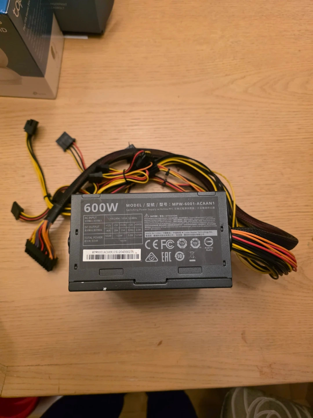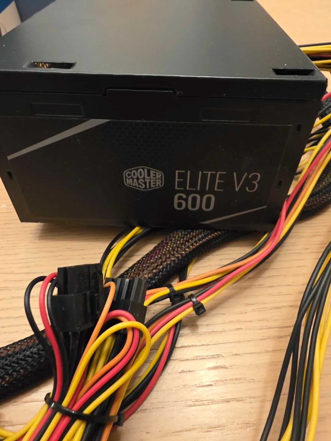 This is a Cooler Master Elite V3 600W power supply. It's a reliable component for desktop computers. 600W total power.