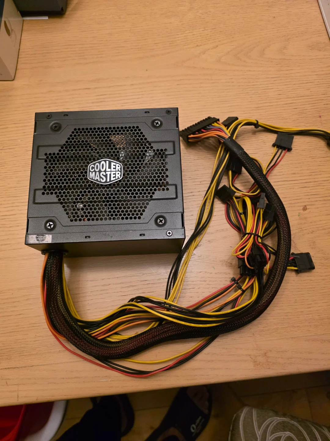 This is a Cooler Master Elite V3 600W power supply. It's a reliable component for desktop computers. 600W total power.