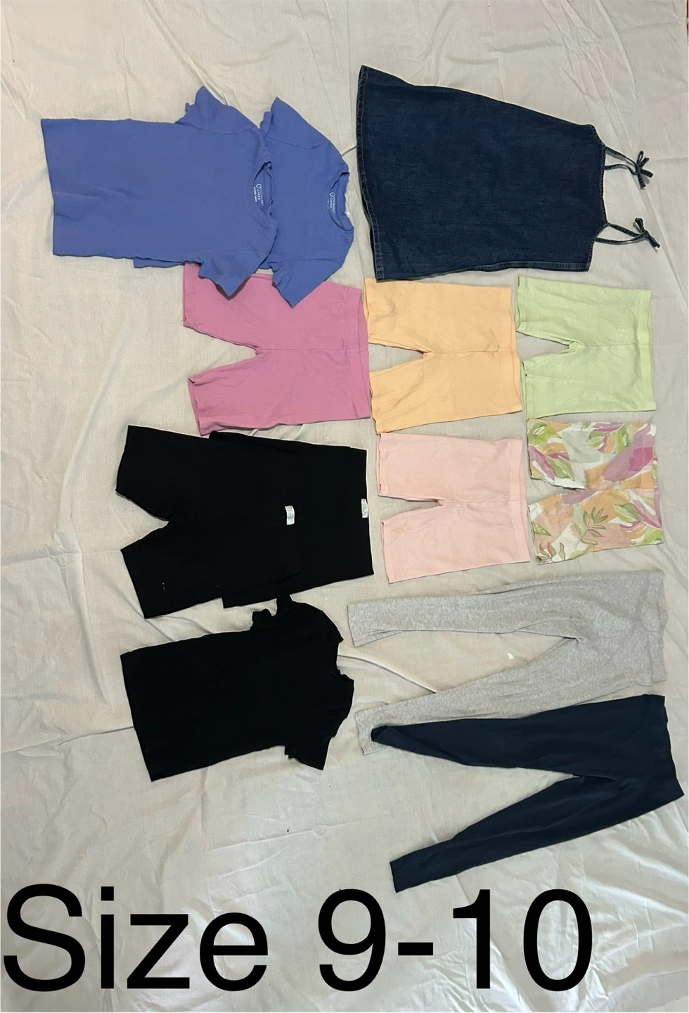 3 T‑shirts, 7 shorts, denim dress, 2 leggings