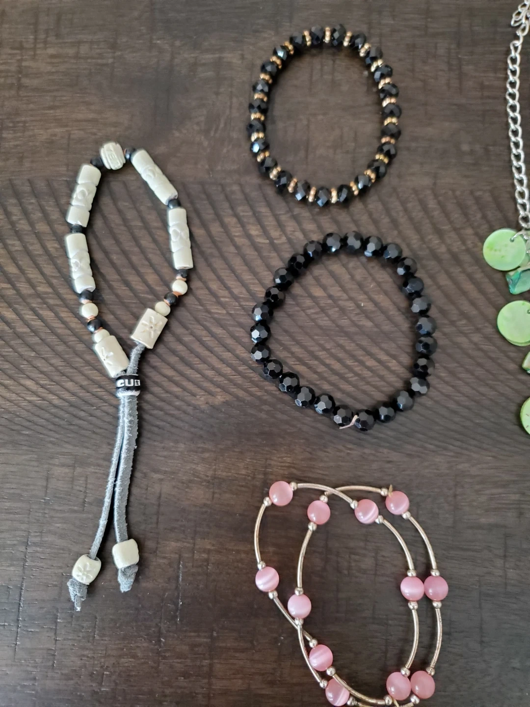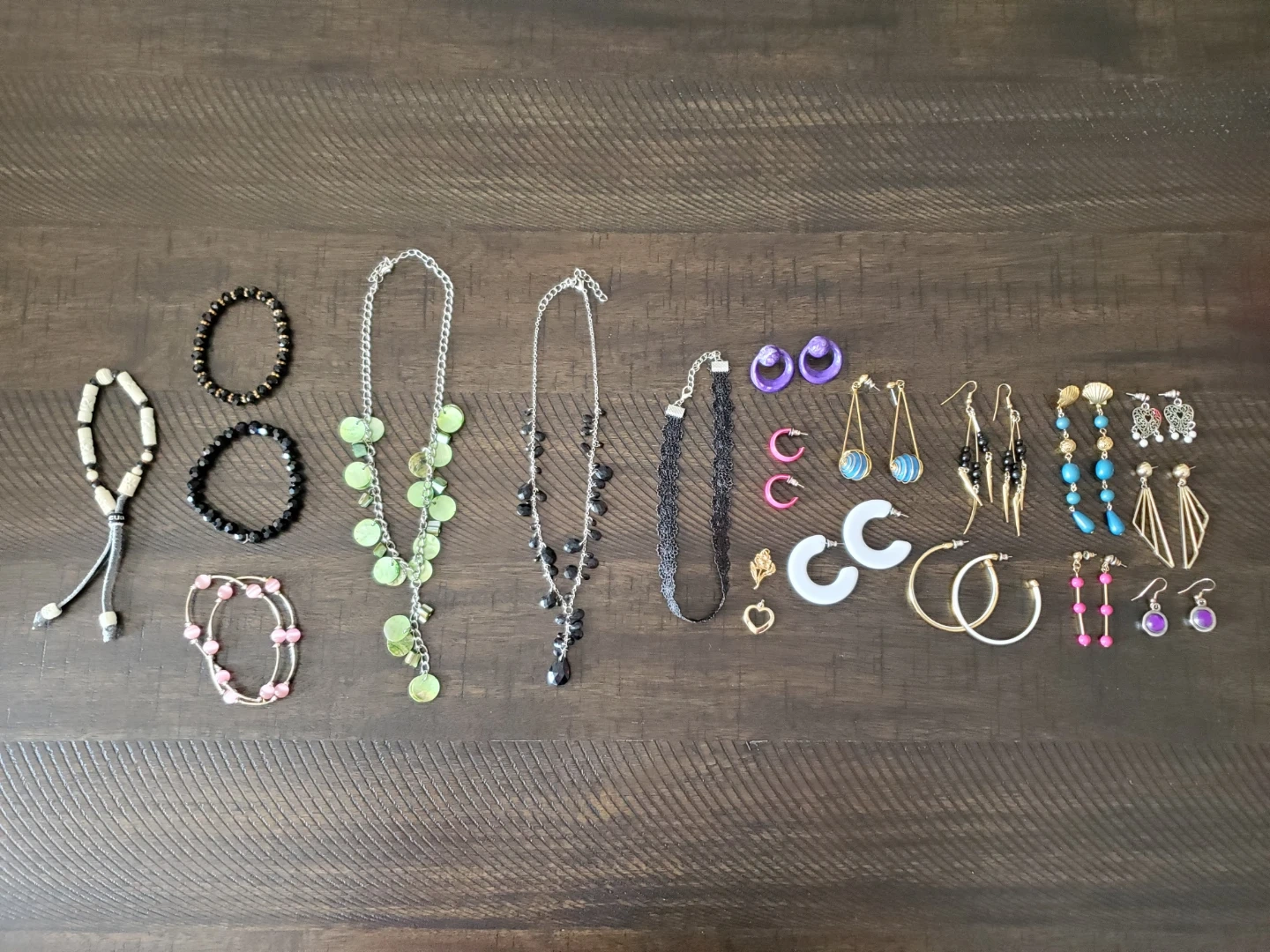 Varied collection of jewelry. Necklaces, bracelets, pendants and earrings. Some are vintage. Lots of different styles and colors. Fun mix.