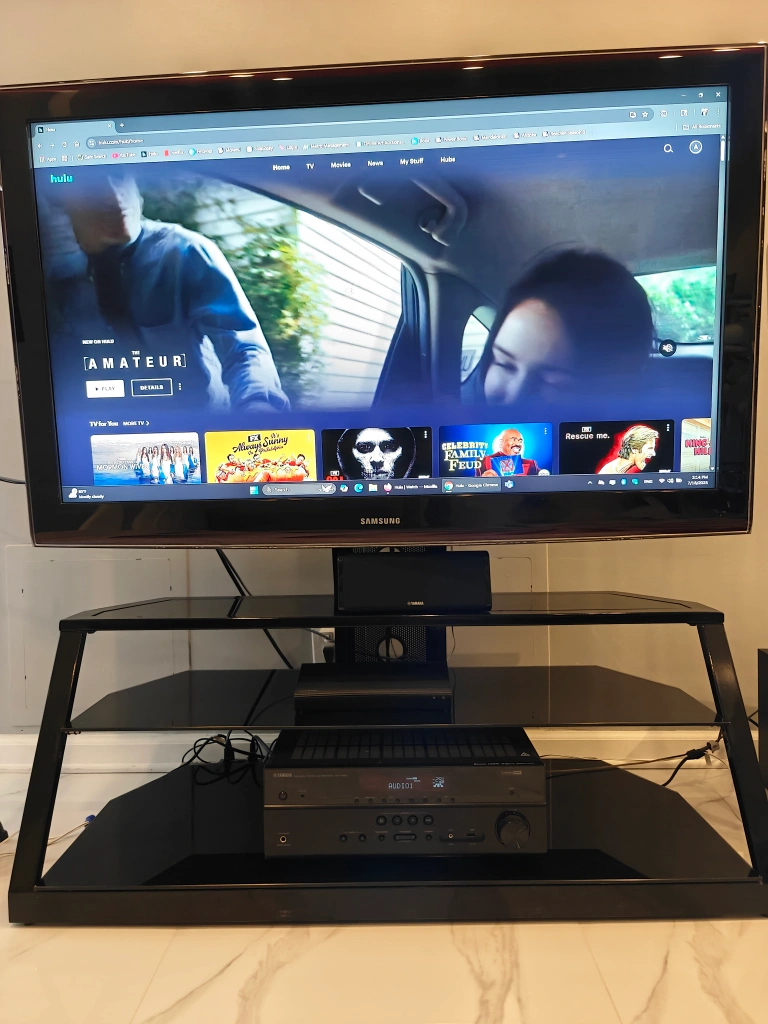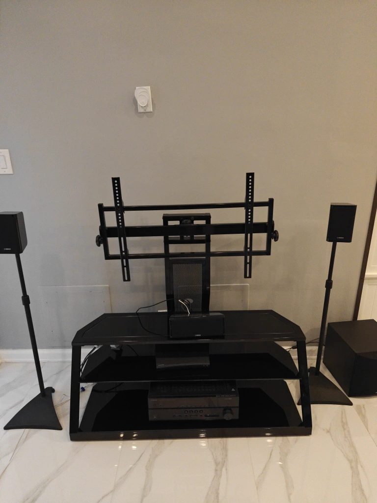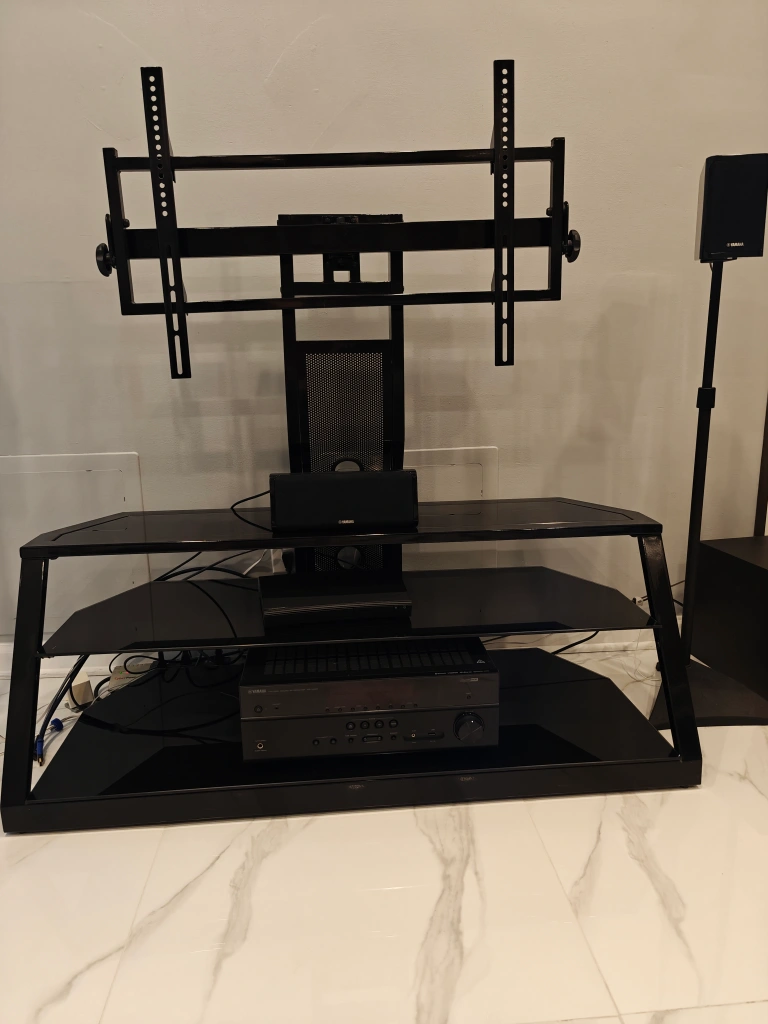 Up to 65in TV stand with full motion mount in excellent condition tempered glass shelves originally paid $300.