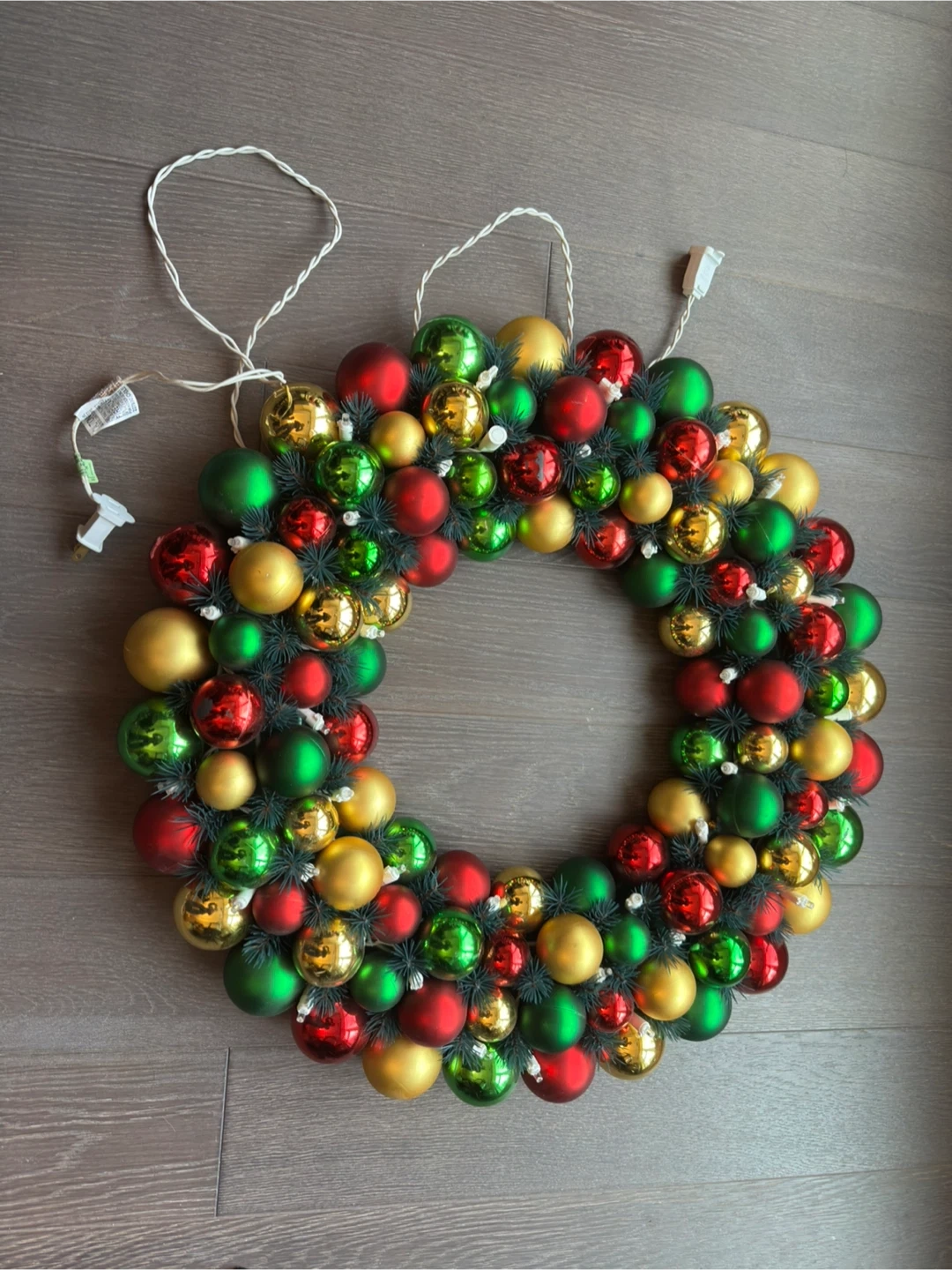 A festive Christmas wreath adorned with red, green, and gold ornaments. It's decorated with faux pine branches and features integrated fairy lights. This wreath measures approximately 22 inches in diameter. It's ready to add some holiday cheer to your home!