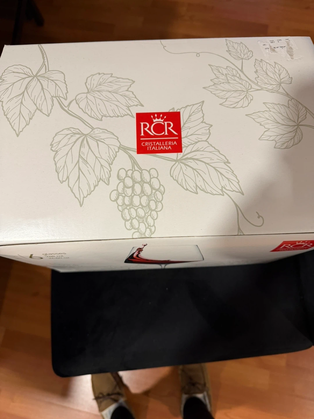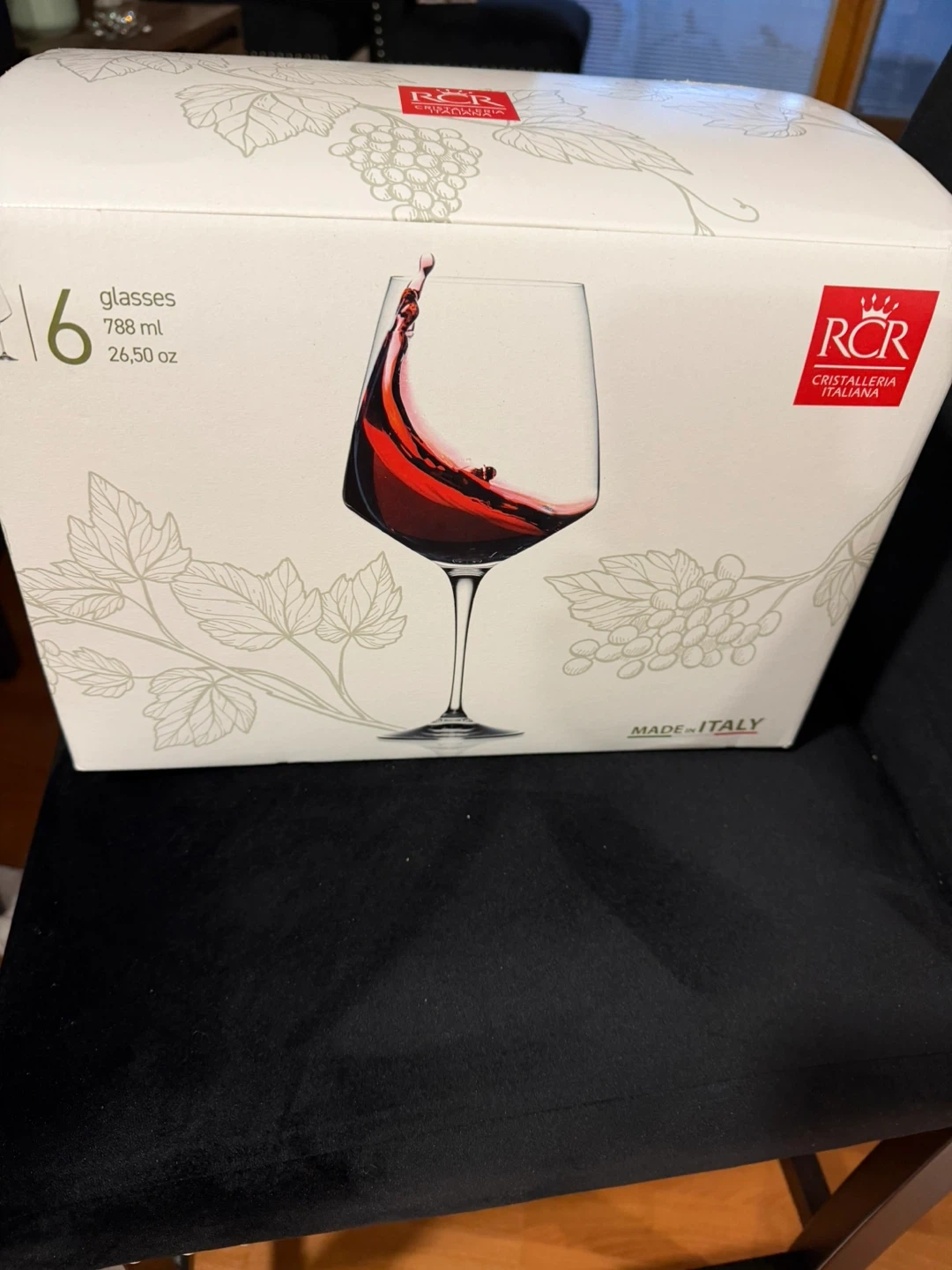 Set of 6 wine glasses from RCR Cristalleria Italiana. Each glass holds 788 ml (26.50 oz). Made in Italy. Crystal glassware.