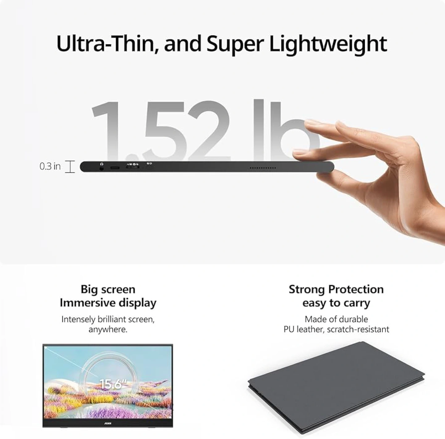 Ultra-thin and super lightweight portable monitor. It's 15.6 inches with a big, immersive display and HDR support. Made of durable PU leather for strong protection, it's easy to carry anywhere!