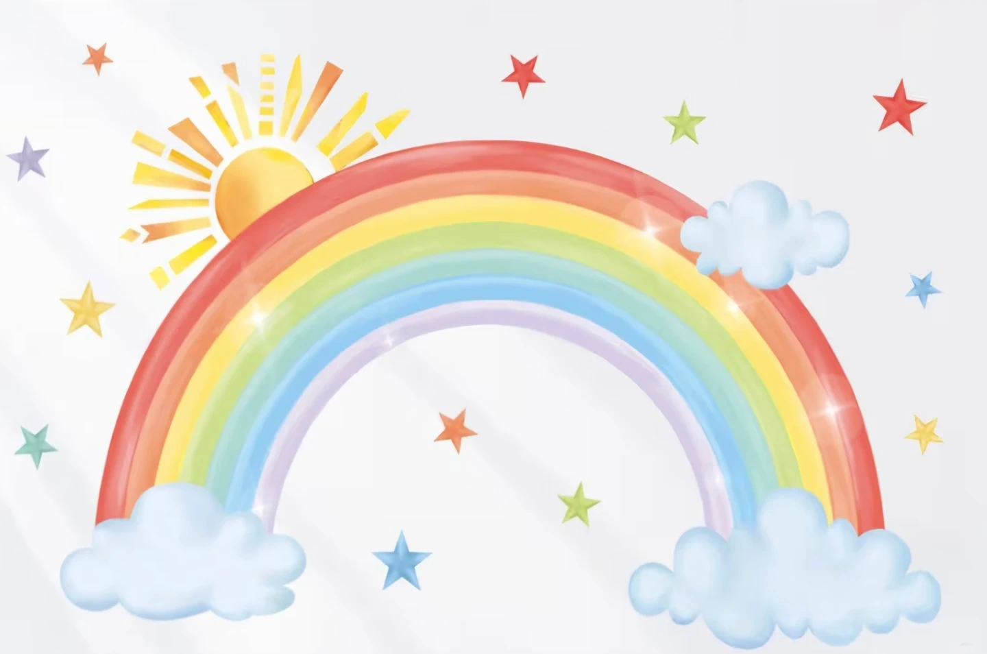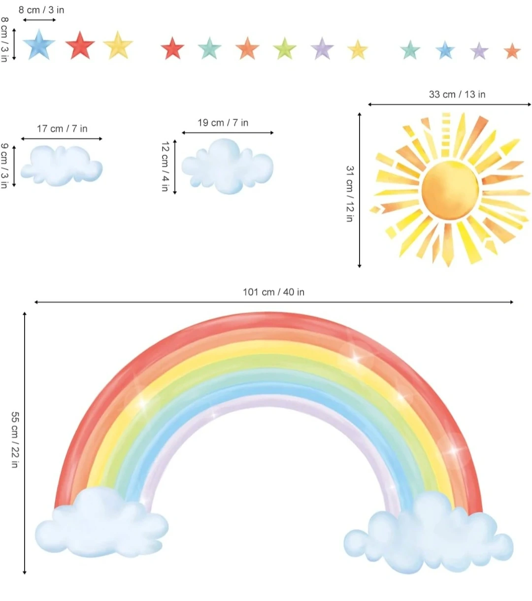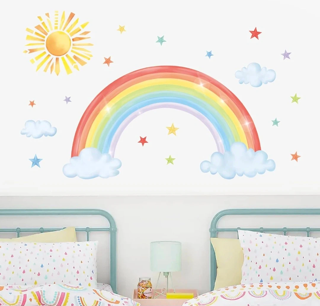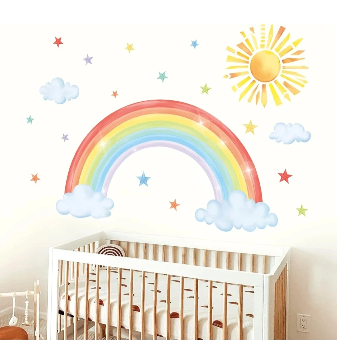 Add a touch of whimsy to your little one's room with these adorable rainbow wall decals! New. They're easy to apply and remove, making them perfect for renters or anyone who likes to change up their decor. The set includes a rainbow, sun, clouds, and stars, so you can create a fun and colourful scene.