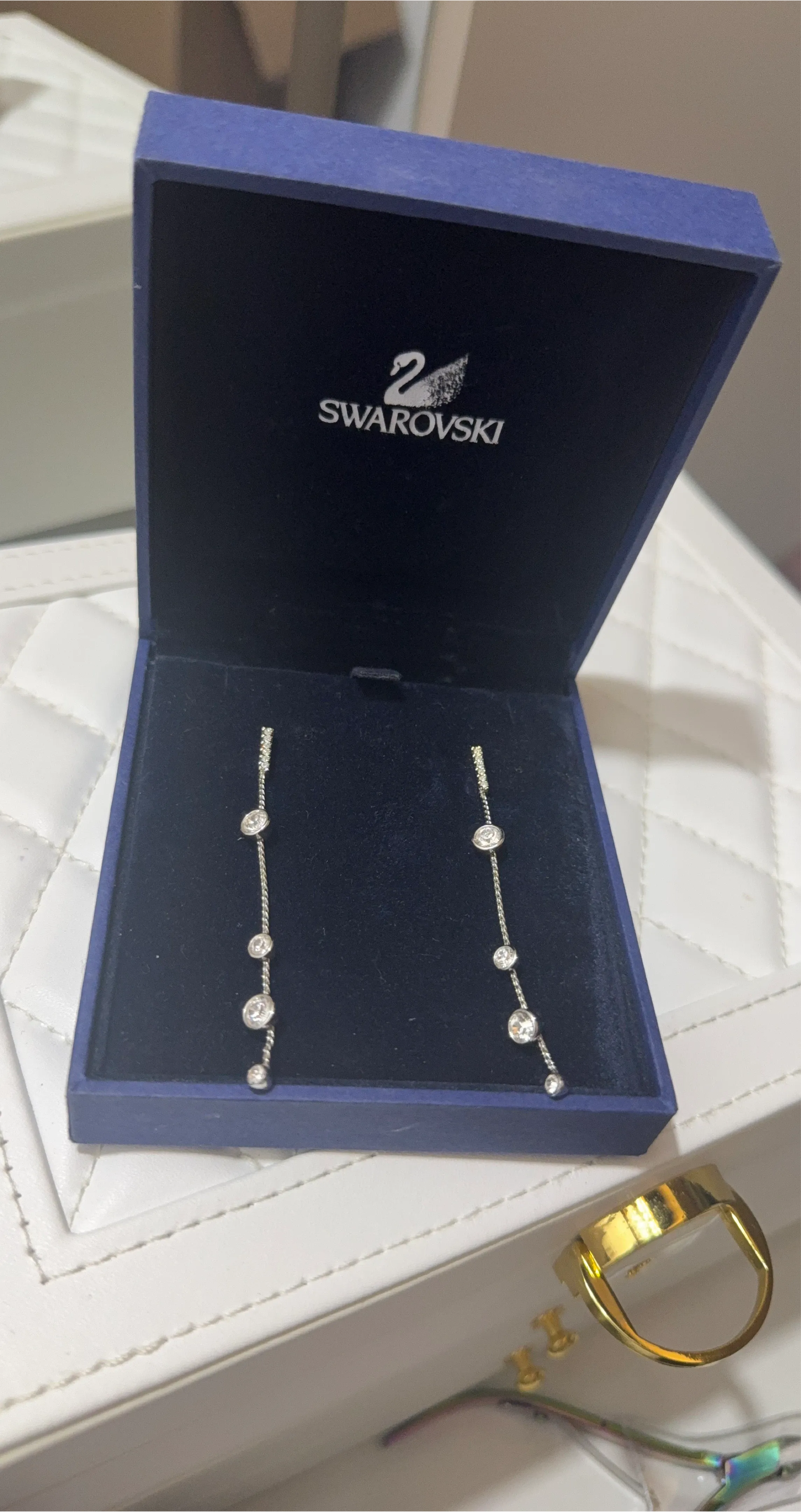 These elegant Swarovski earrings feature delicate chains with sparkling crystal accents. They dangle beautifully and come in the original blue Swarovski box. Perfect for adding a touch of glamour to any outfit!