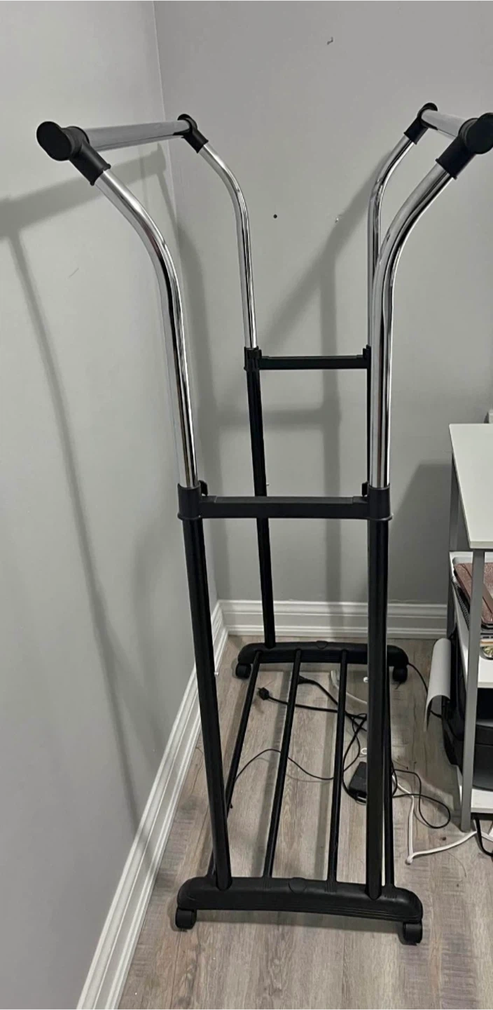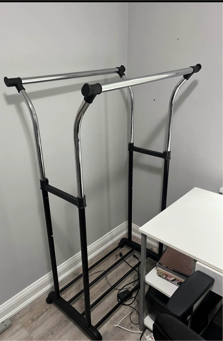This double garment rack is perfect for organizing your closet or for use in a laundry room. It's made with a sturdy metal frame and includes wheels for easy mobility. Plenty of hanging space for all your clothes!