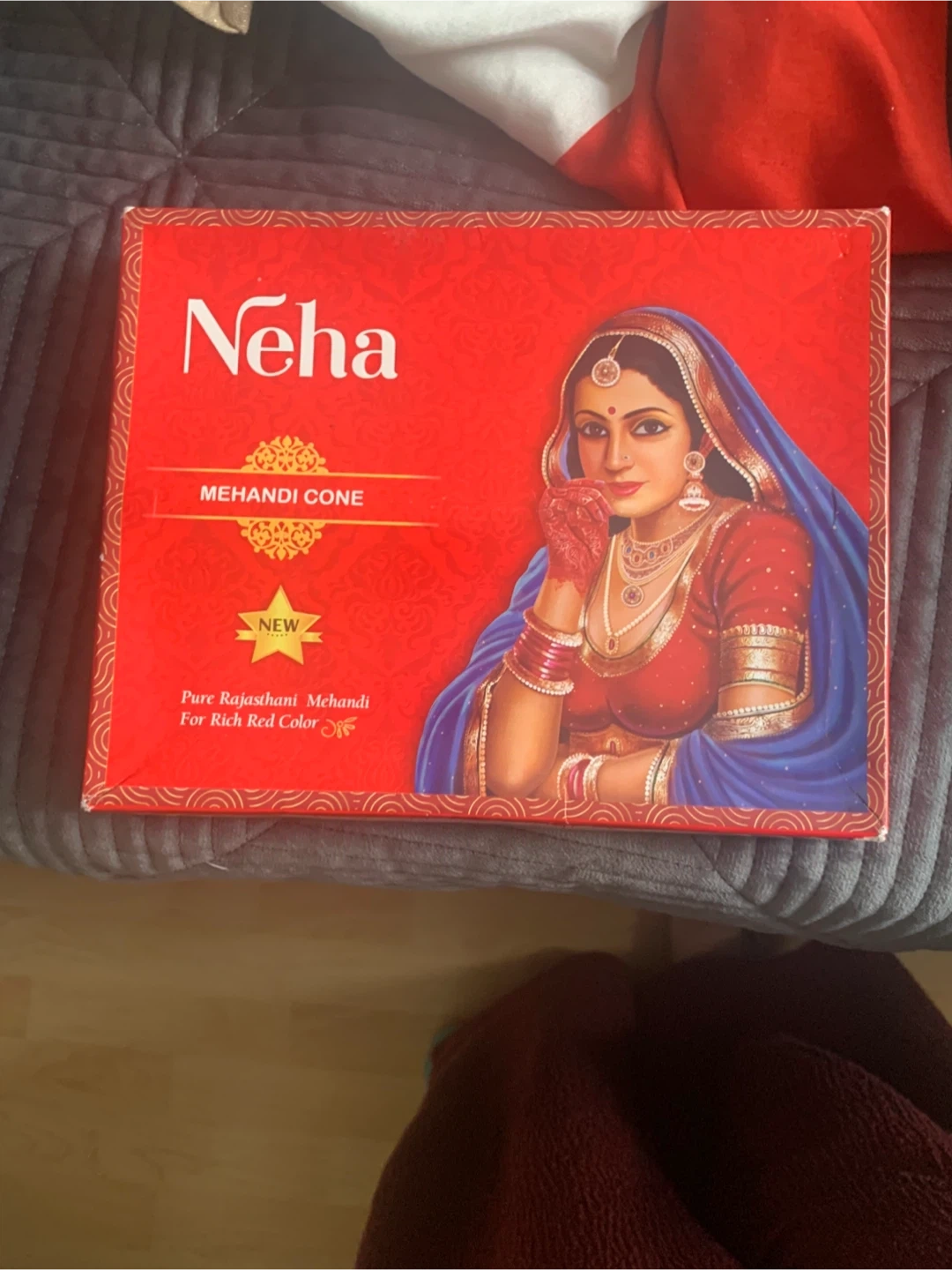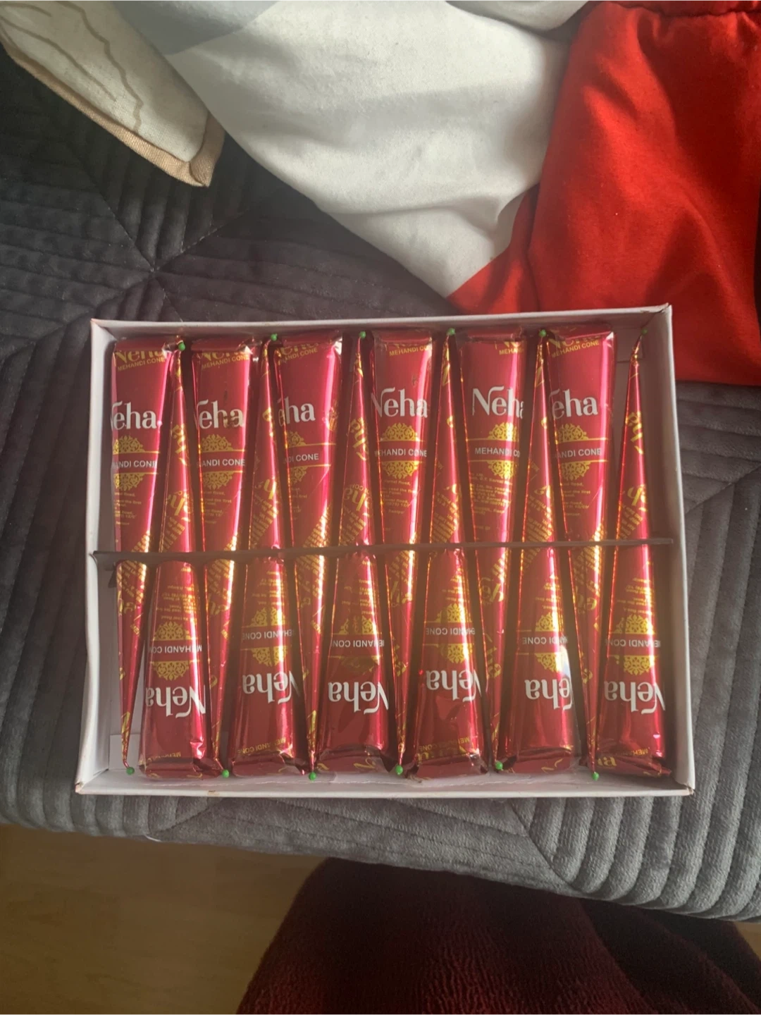 This is a box of 12 Neha Mehandi Cones. It's pure Rajasthani Mehandi for a rich red color. These cones are ready to use for easy application.