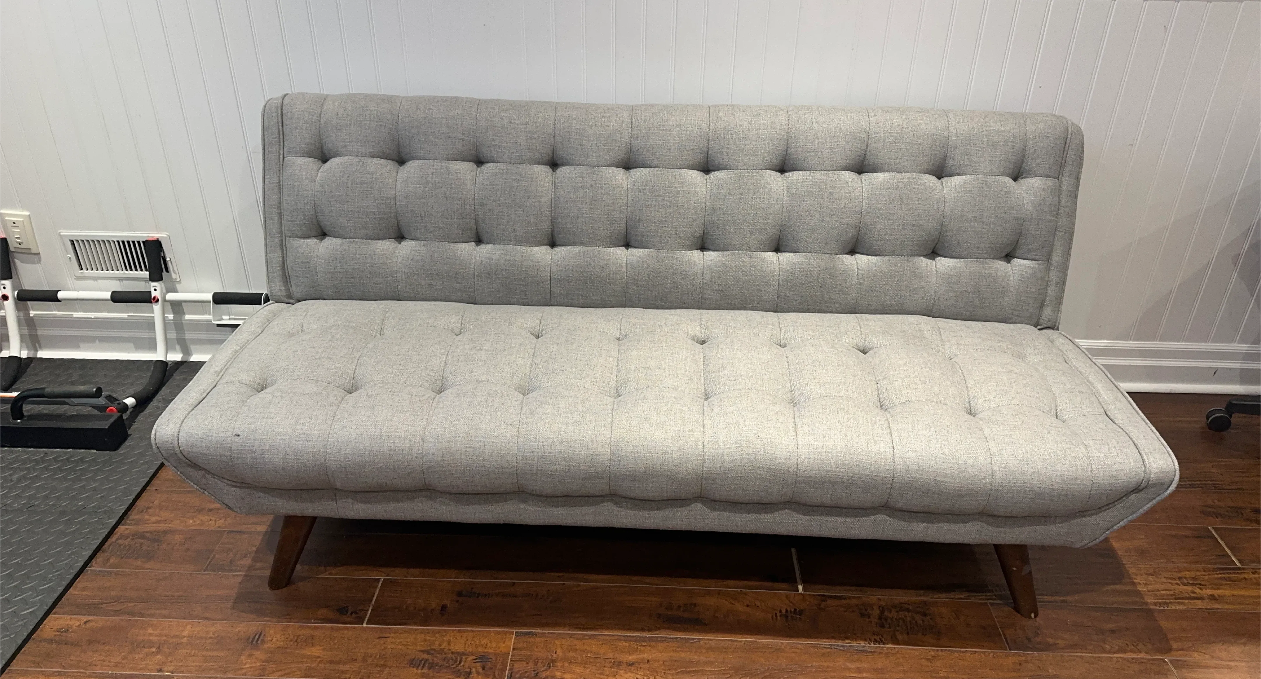 This grey loveseat sofa features tufted cushioning and wooden legs. It's upholstered in a textured fabric. It's a stylish addition for a living room or den!