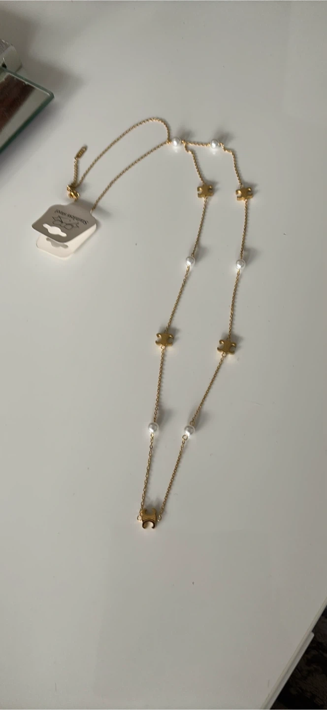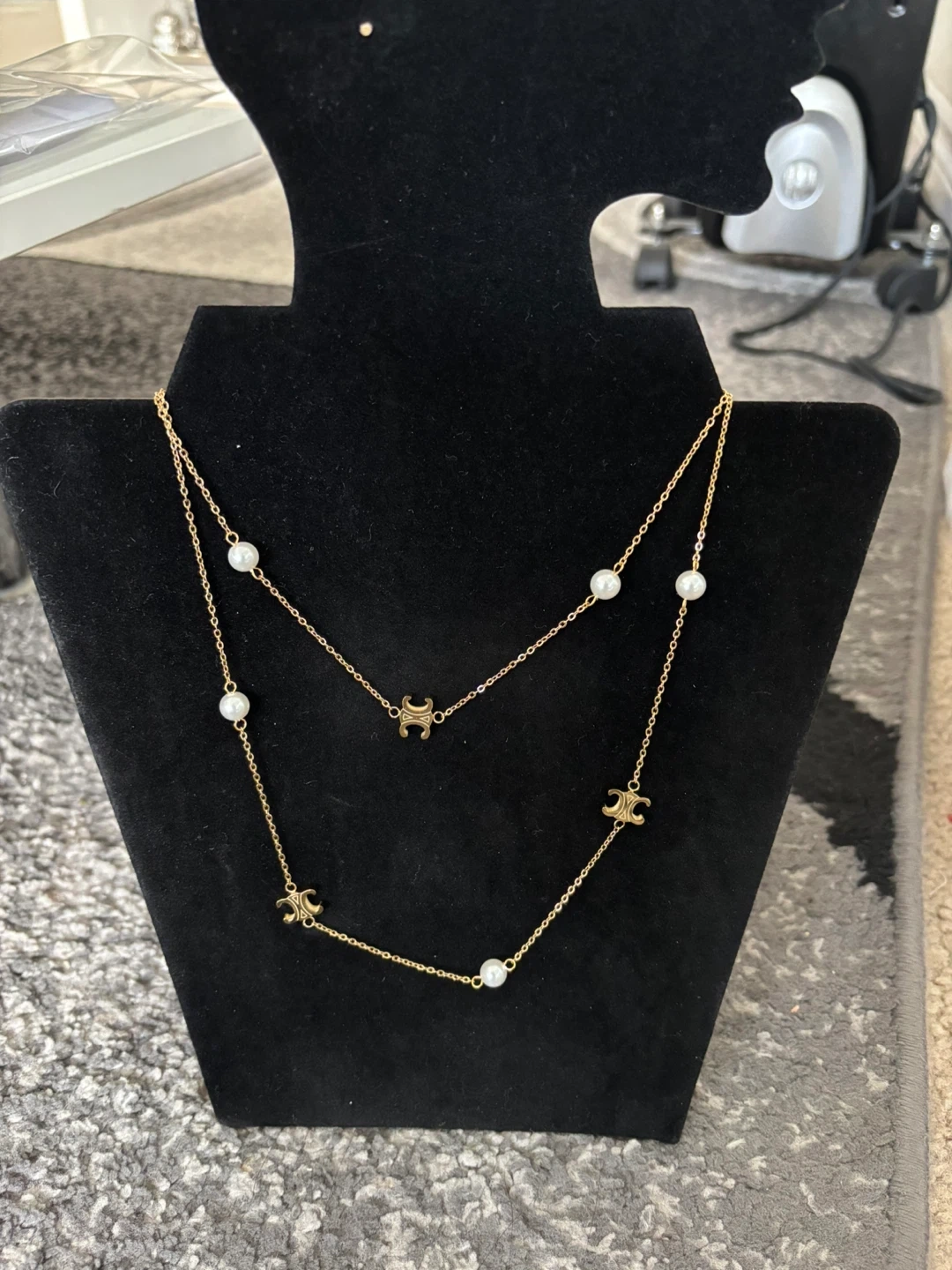 Gold plated necklace features gold-plated tone hardware and pearl accents. It's a beautiful piece to add a touch of elegance to any outfit. The necklace is in great condition