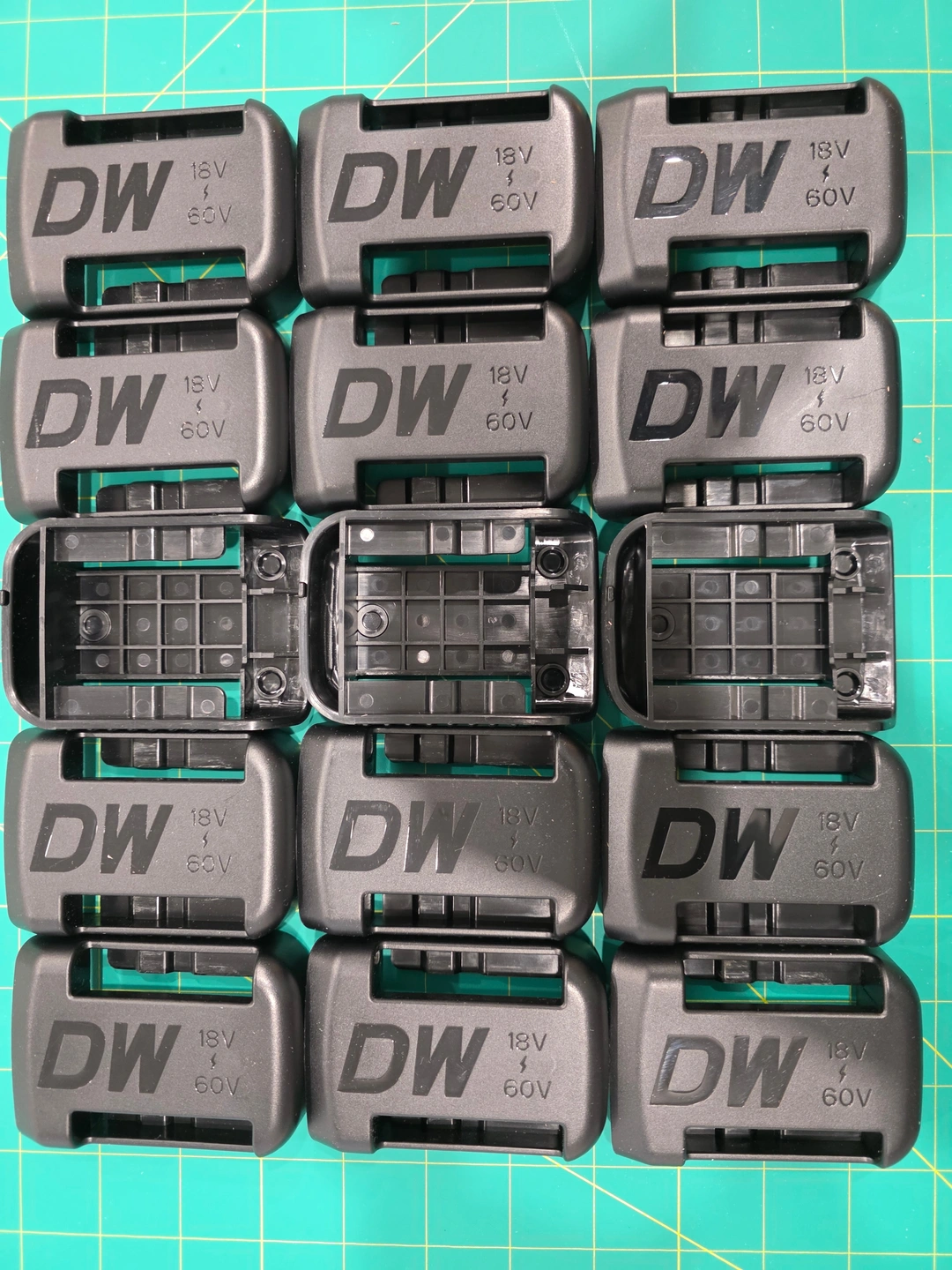 Battery terminal protective covers compatible with DeWalt 18V and 60V batteries. Great for keeping contacts clean, safe, and protected during storage or transport.