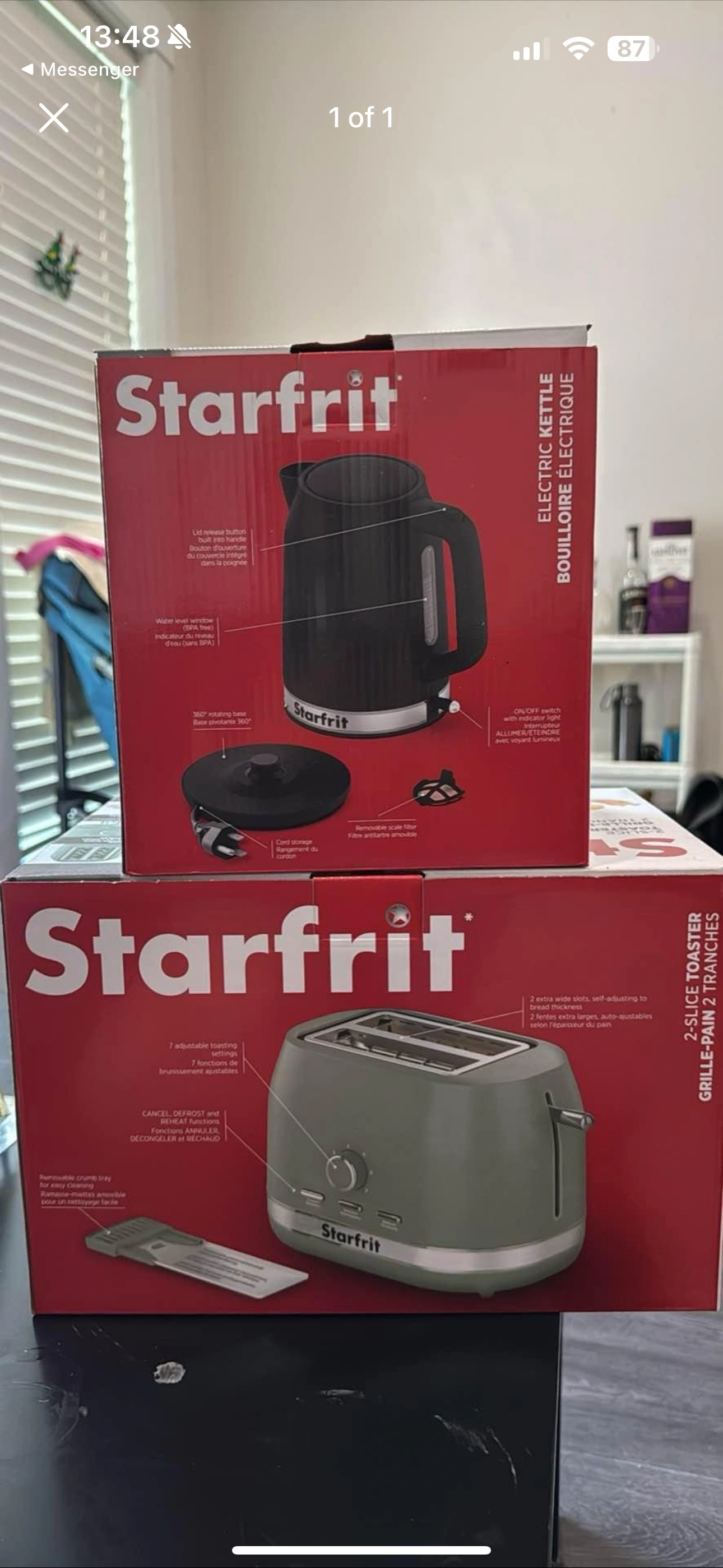 This listing is for a brand new Starfrit electric kettle and a Starfrit 2-slice toaster. Both items are in their original packaging and completely new unused. Got it as a gift but needed. Can sell both for 40$.