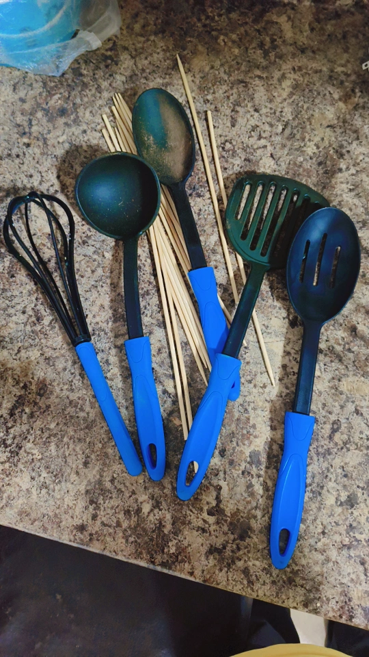 Selling a set of kitchen utensils. Includes a whisk, ladle, slotted spoon, spoon, and wooden skewers. The utensils have blue handles.FreeCycle