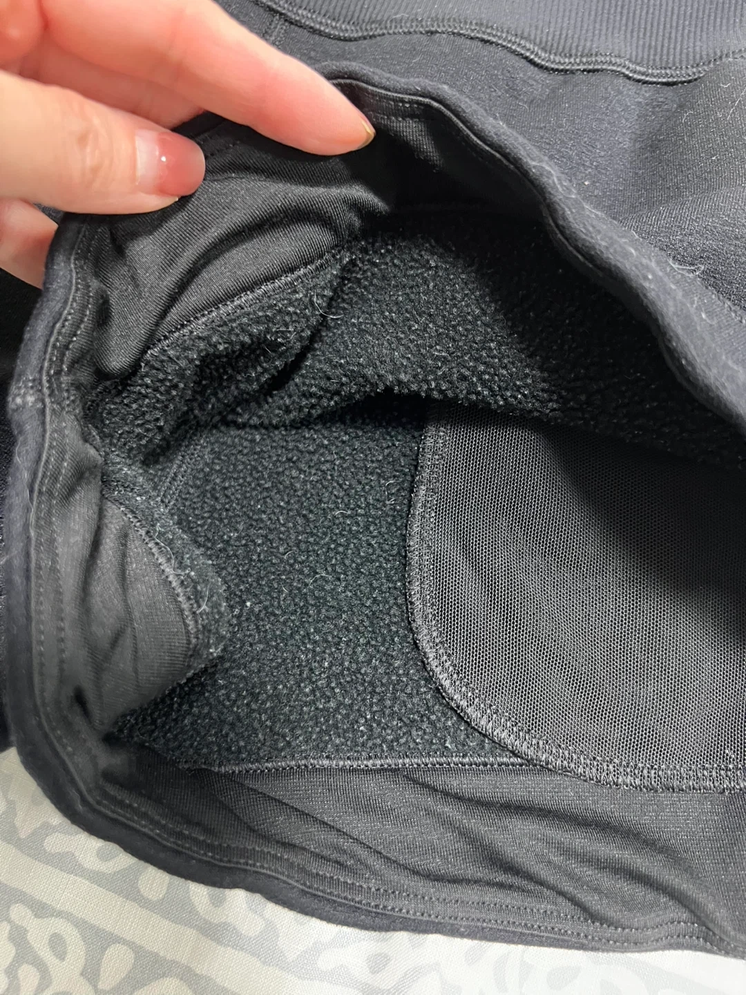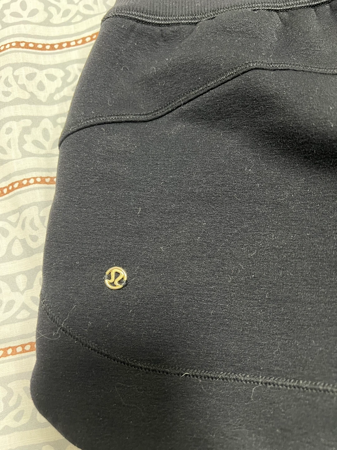 These are Lululemon black shorts. They're made of a comfortable fabric blend. Perfect for workouts or casual wear!