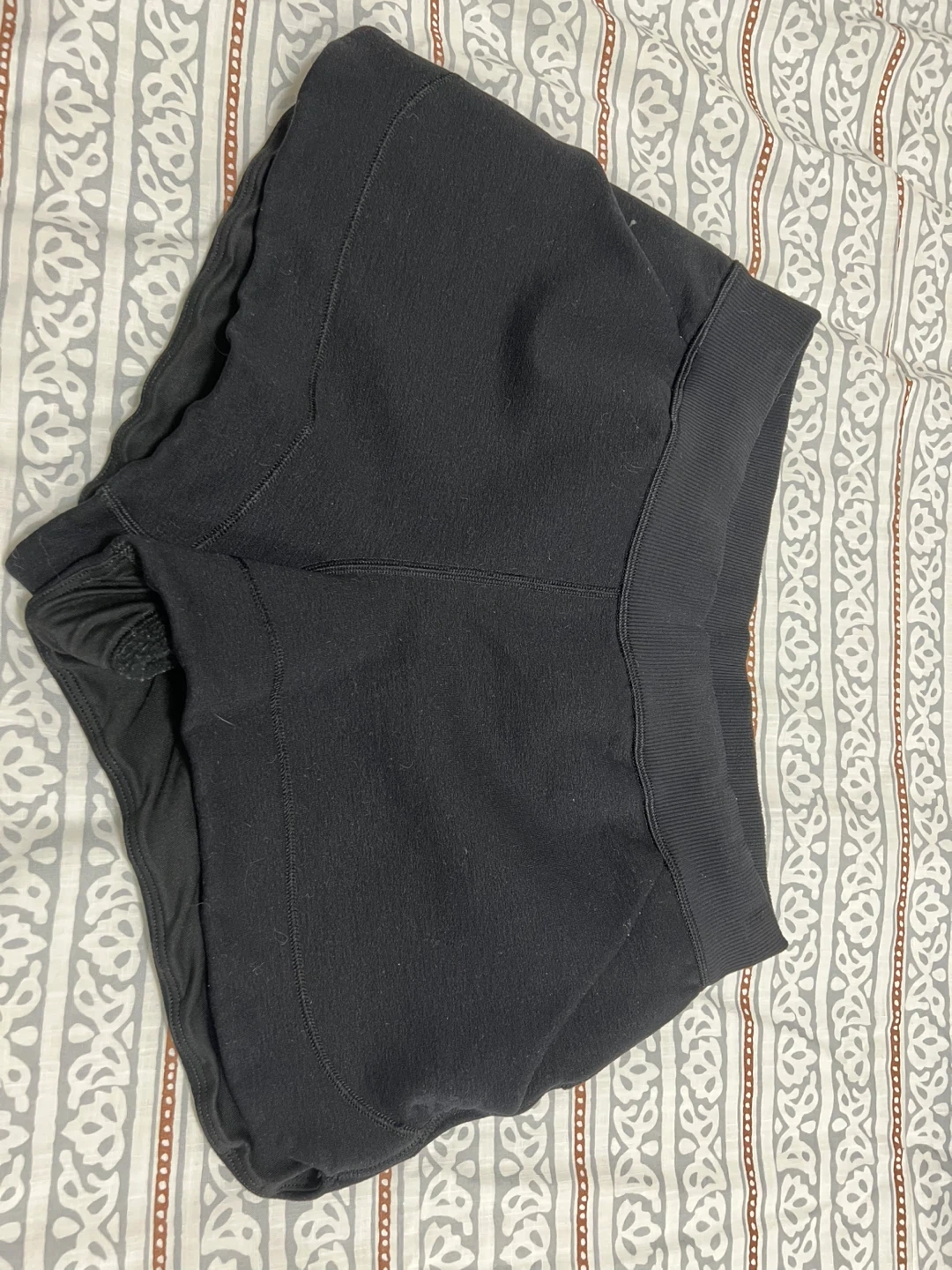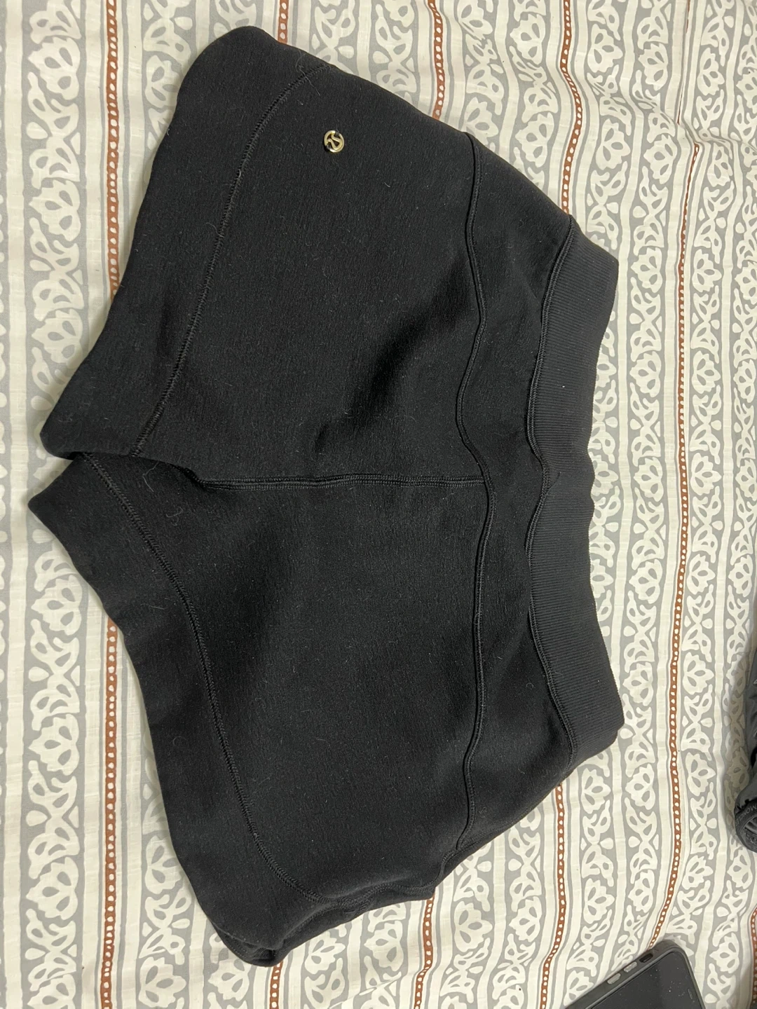 These are Lululemon black shorts. They're made of a comfortable fabric blend. Perfect for workouts or casual wear!