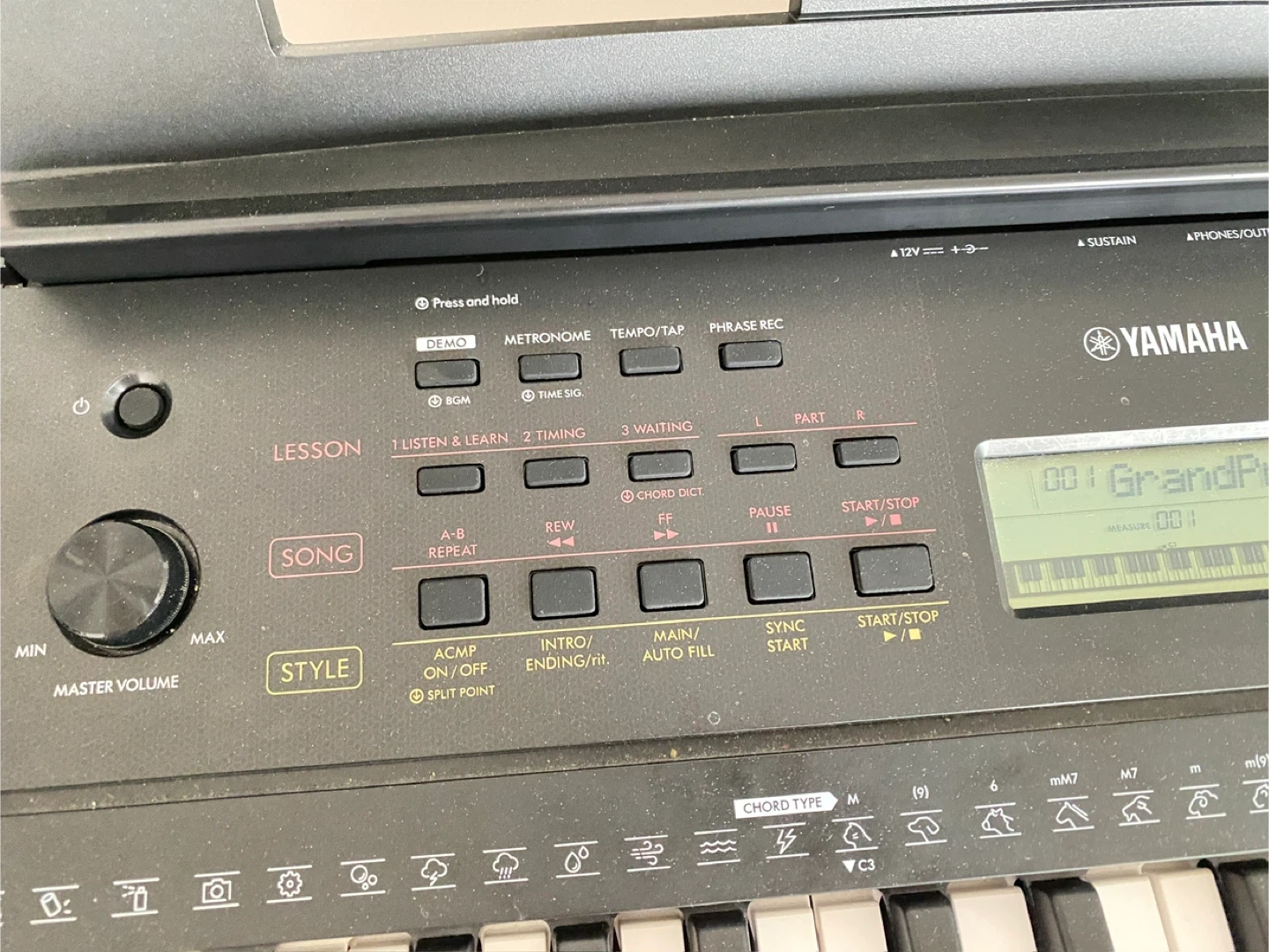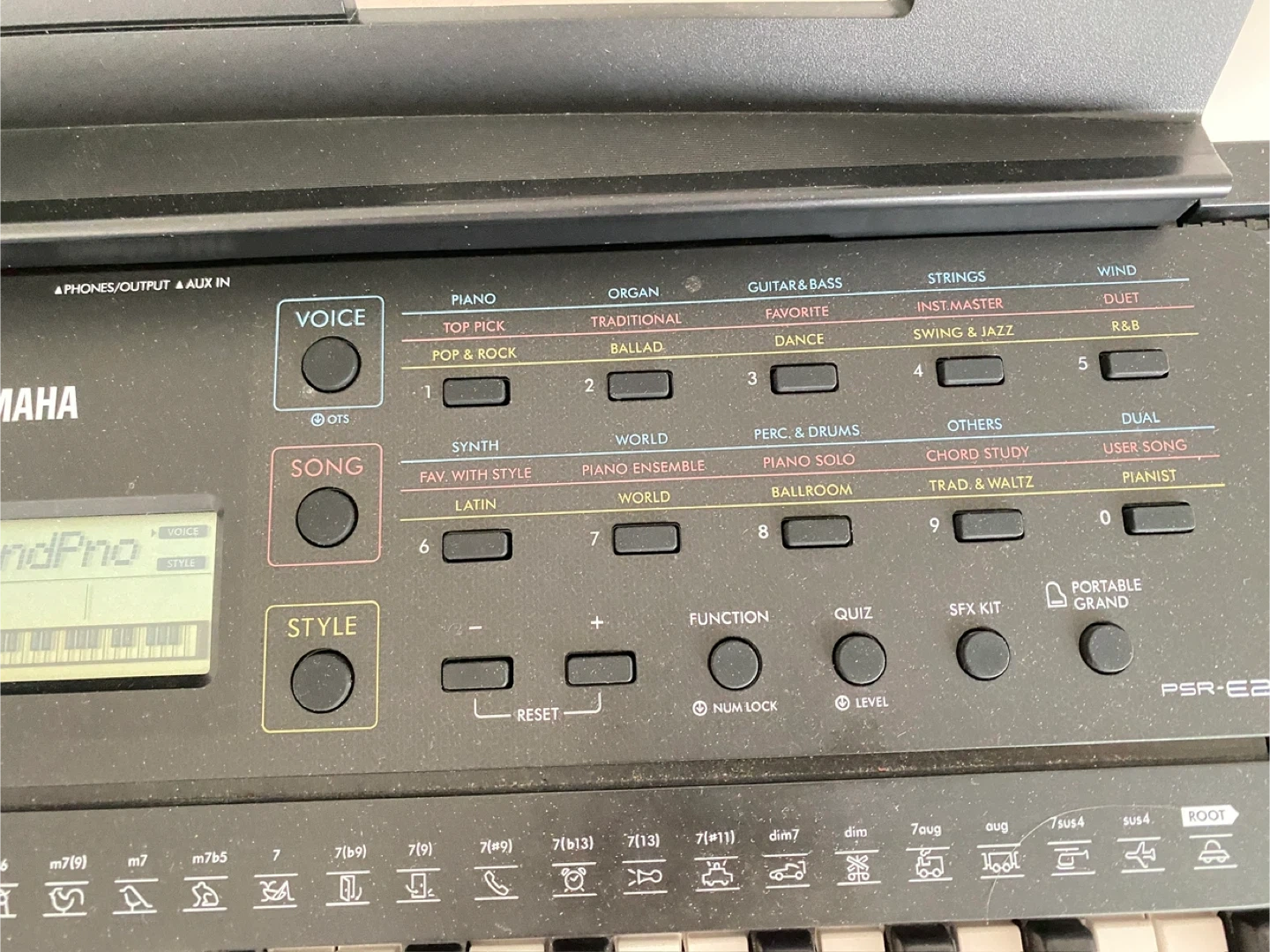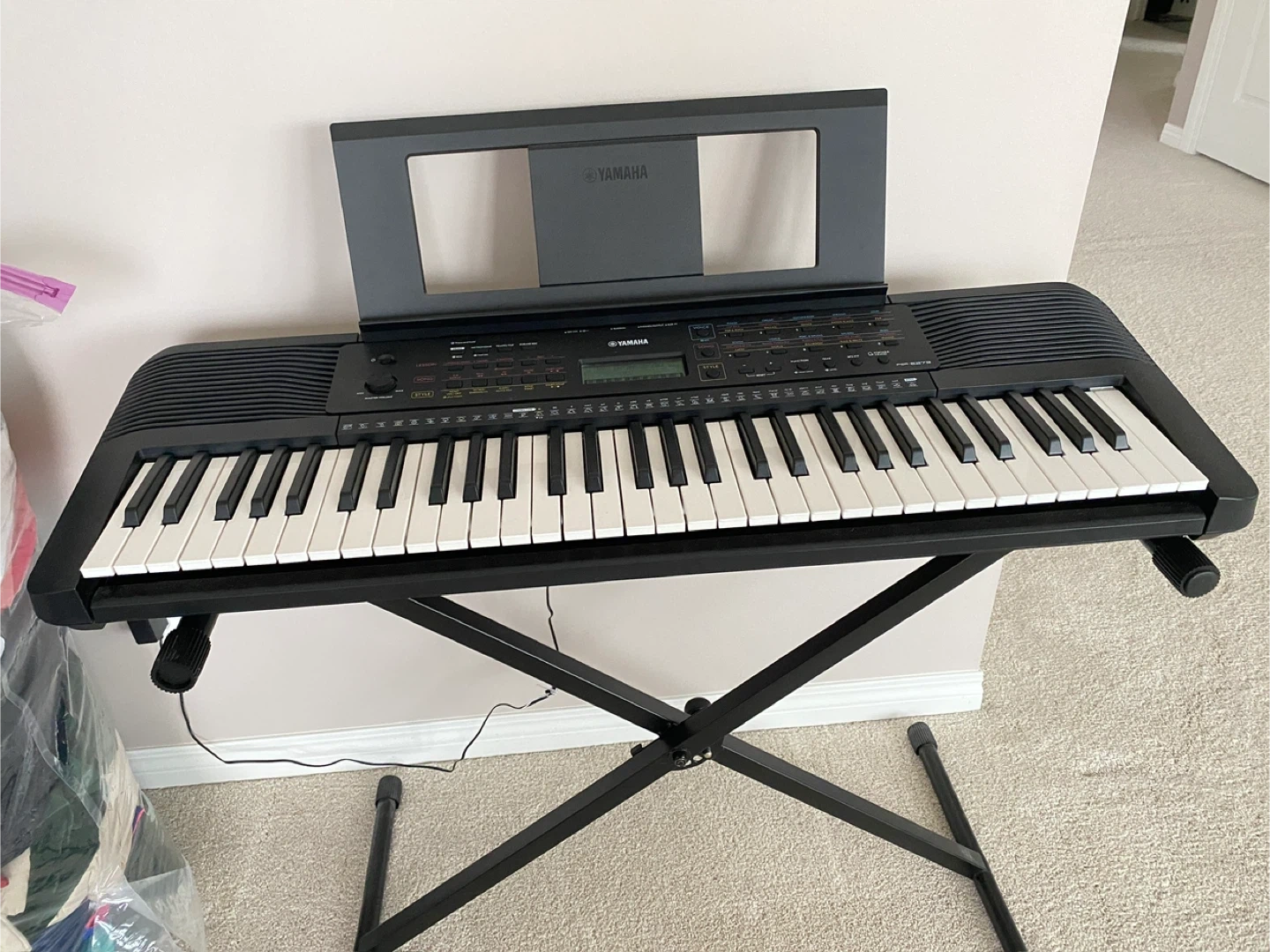 This is a Yamaha Portable Grand PSR-E203 electronic keyboard. It's great for learning to play with its lesson functions. Comes with a sturdy X-style stand. Fun for all ages!