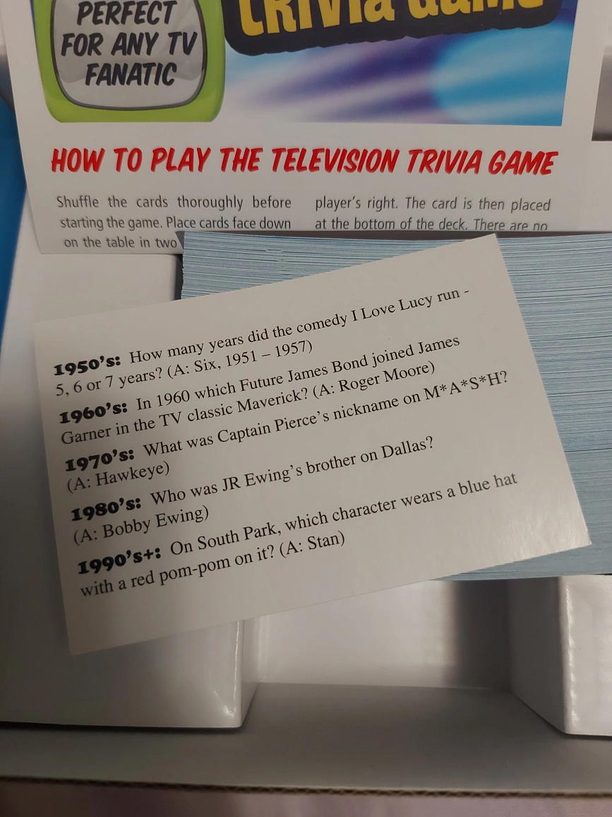 -240 cards with questions from the 1950s, 1960s, 1970s, 1980s, 1990s