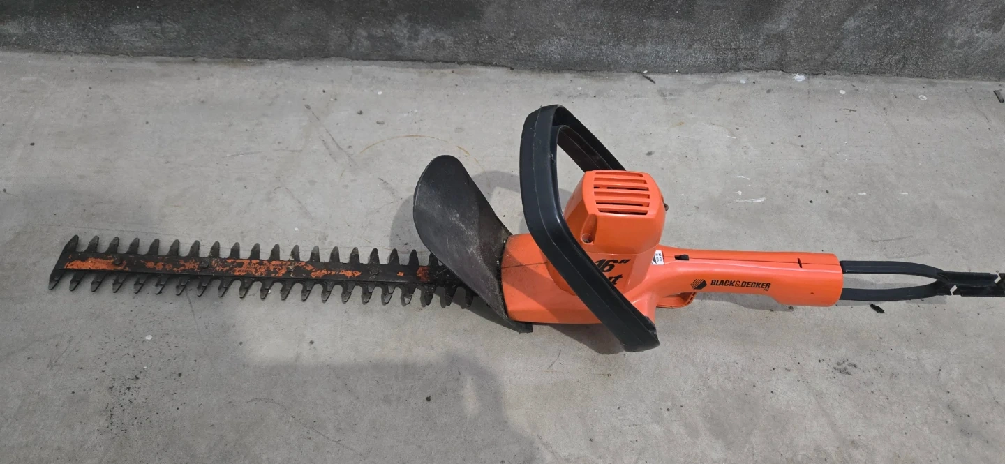 This Black & Decker electric hedge trimmer features a 13-inch blade. It's orange and black, designed for trimming hedges. This tool is useful for yard maintenance.