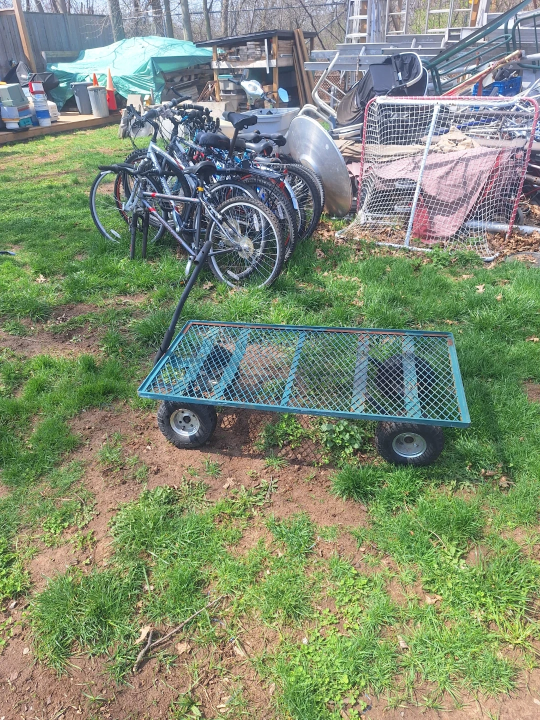 A durable green metal garden cart, perfect for hauling soil, plants, or tools around your yard. It features a mesh bed and sturdy wheels for easy transport. The handle makes it simple to manoeuvre.