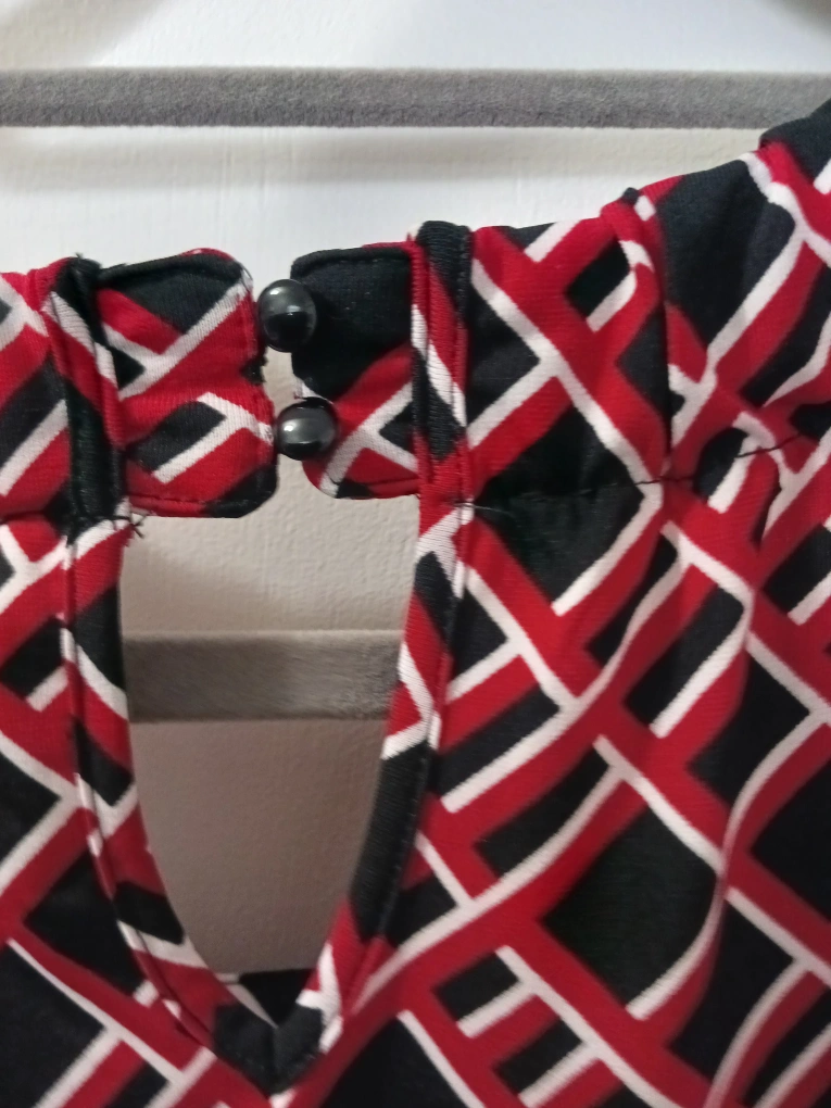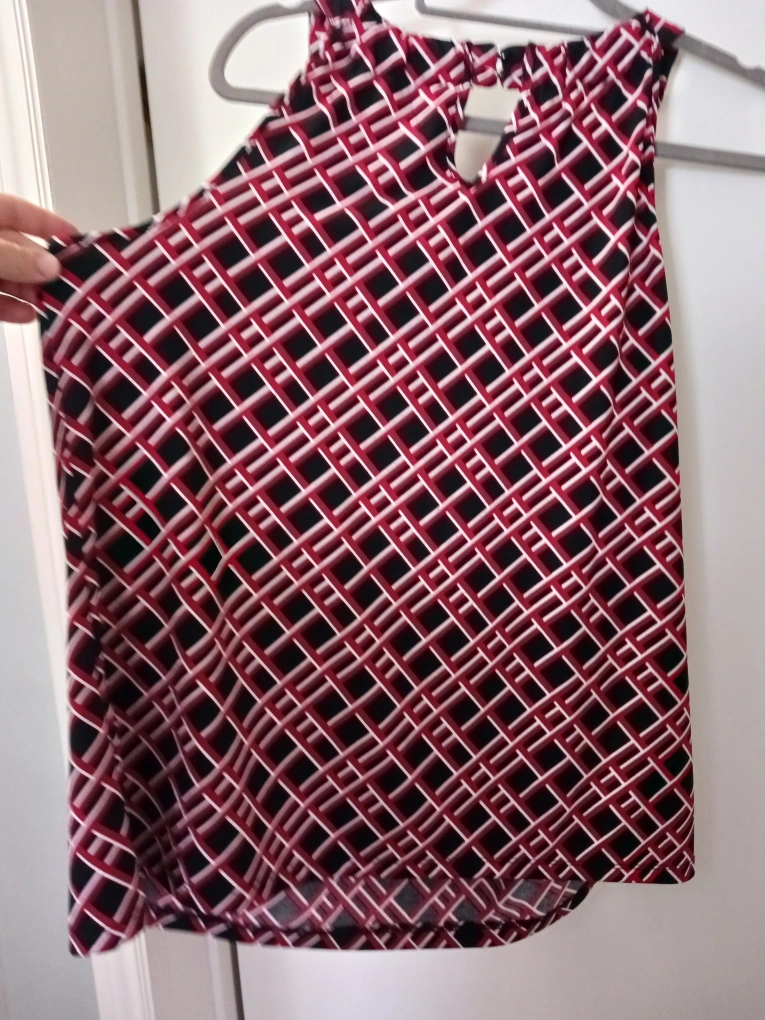 This is a sleeveless, geometric print tank top with a keyhole back. It features a red, black and white pattern with a high neck. The top is buttoned at the neck, from Ricki's, XL.