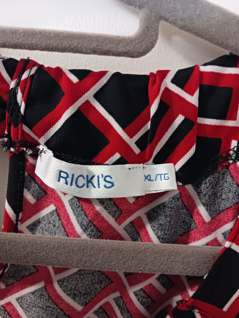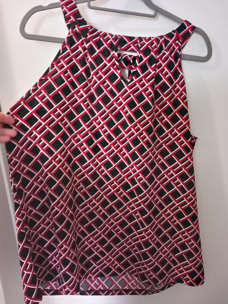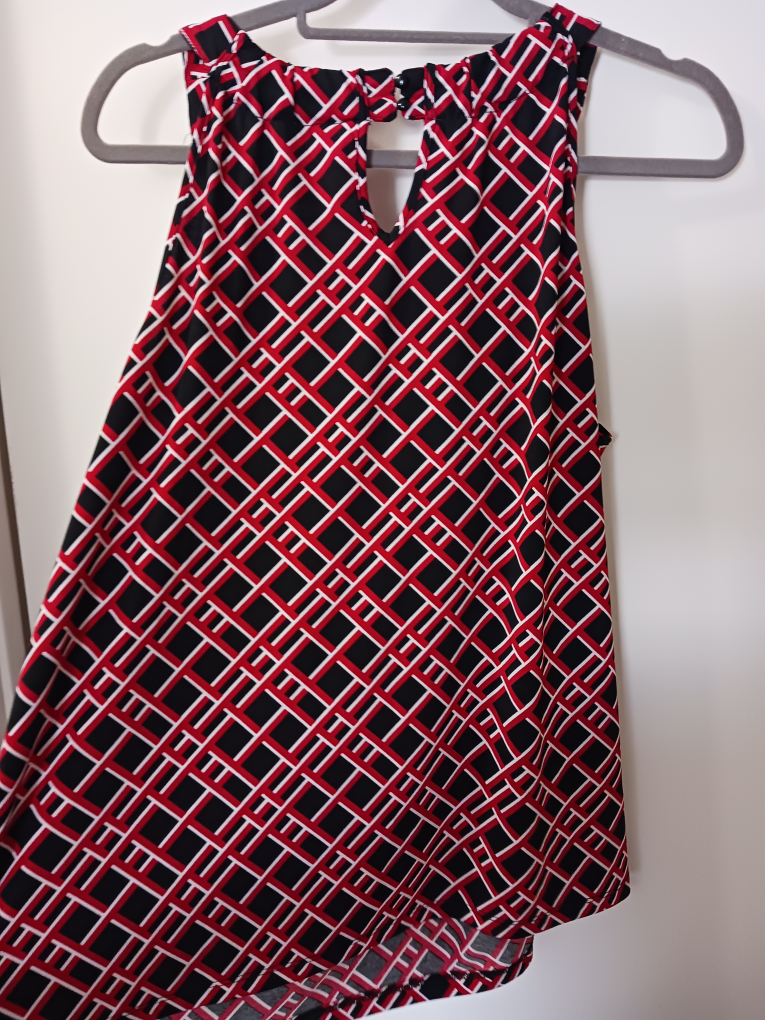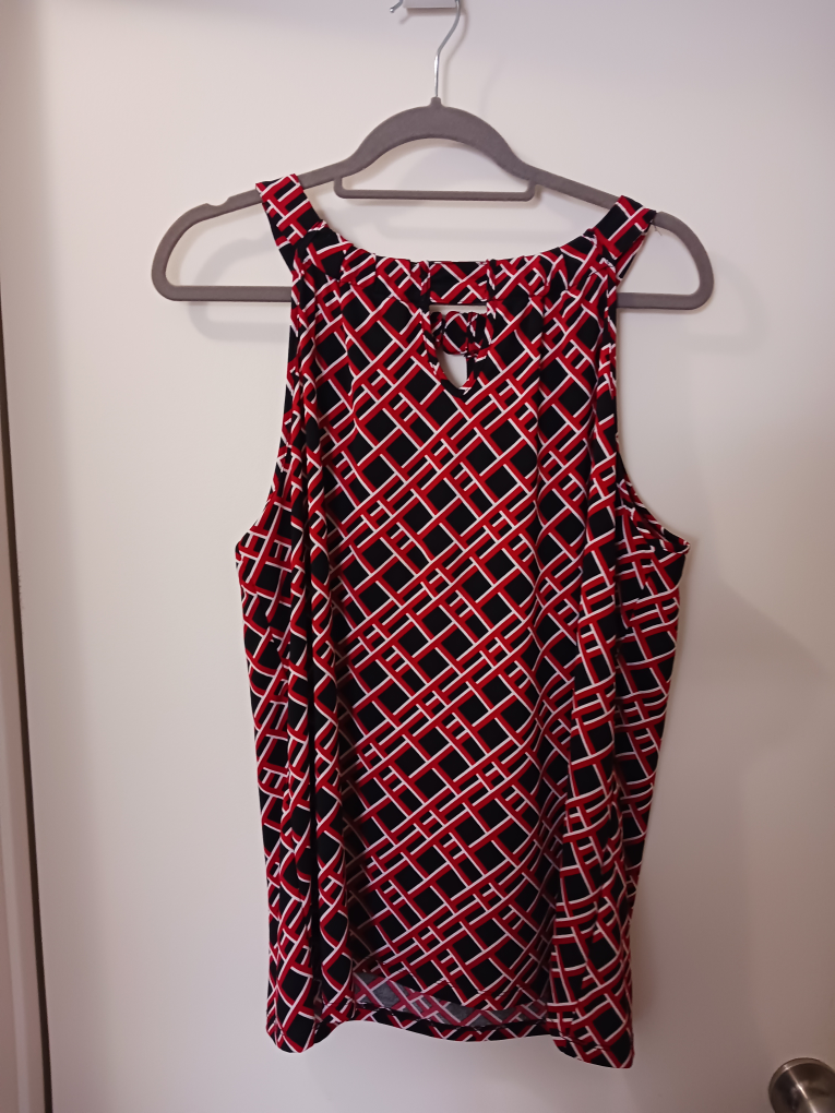 This is a sleeveless, geometric print tank top with a keyhole back. It features a red, black and white pattern with a high neck. The top is buttoned at the neck, from Ricki's, XL.