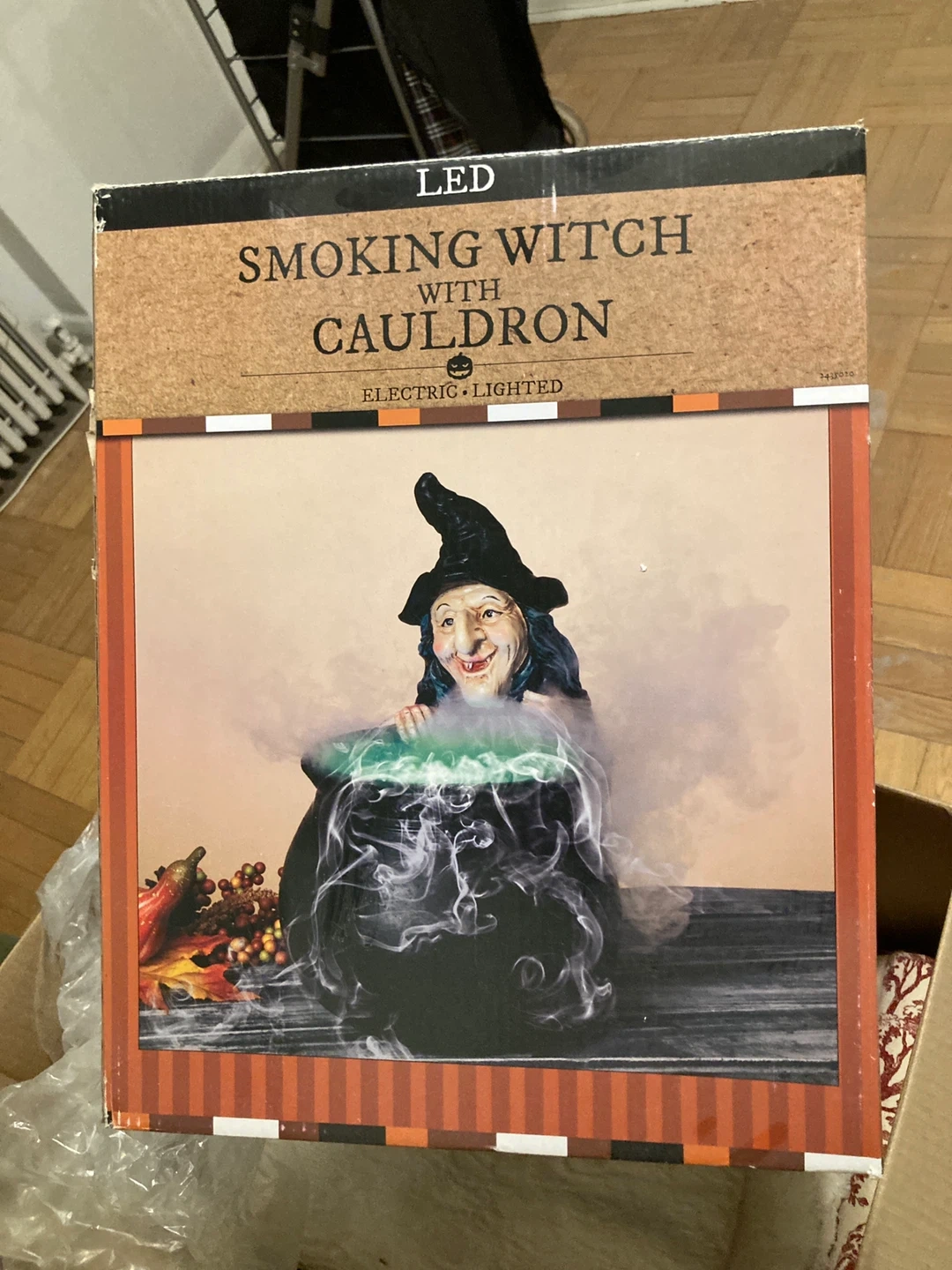 This electric, lighted Halloween decoration features a smoking witch with a cauldron. It's perfect for adding a spooky touch to your home this fall. The witch is designed with LED lights and creates a smoking cauldron effect.
