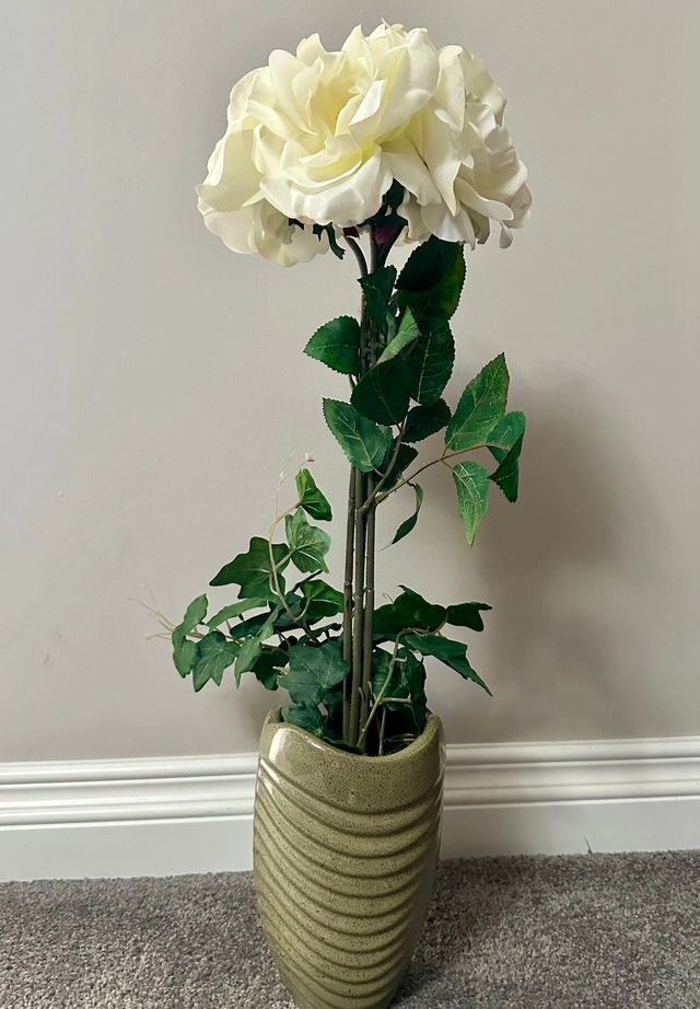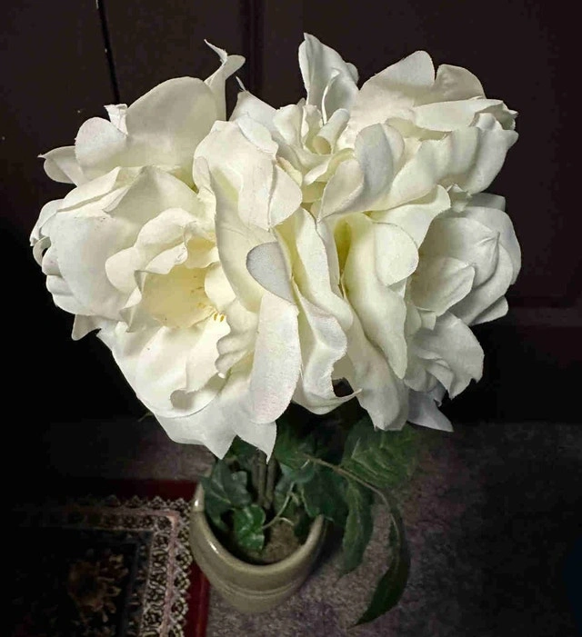 This lovely decorative plant features full, creamy white blossoms atop a sturdy stem and lush green foliage, adding a touch of nature to any room. It comes pre-potted in a stylish, textured ceramic vase, ready to display. Its size makes it perfect for adding a focal point to a shelf, desk, or small corner. Realistic floral arrangement, elegant ceramic pot, and a neutral color palette to suit any décor. If the ad is up, the plant is available!
