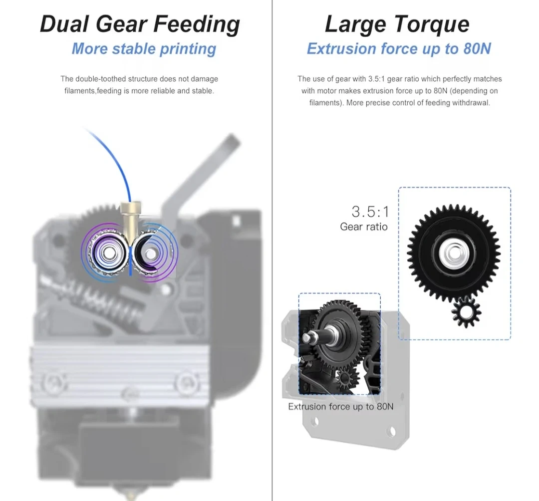 【Large torque, Extrusion force up to 80N】The extrusion force can reach 80N (depending on filament) by 3.5:1 gear ratio perfectly matched with the motor. More accurate of feeding withdrawal.